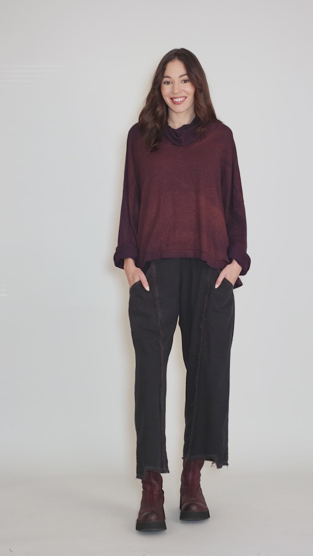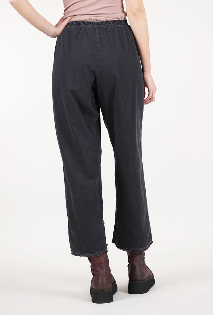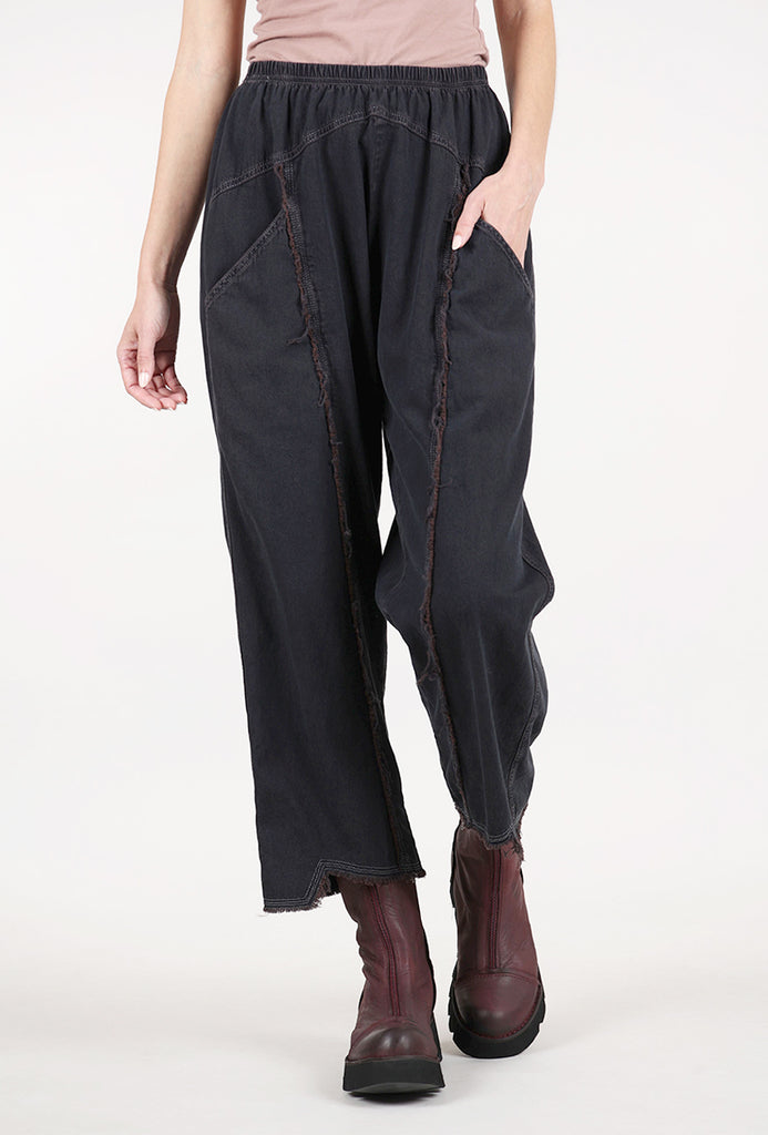 We love these! Made in a VERY soft cotton denim, Kind has an elastic waistband, with slit pockets on the hips and not-too-full lantern-shaped legs that end in a cute tulip hemline. Raw seaming creates subtle fringing throughout. The fit is relaxed, but not oversized.