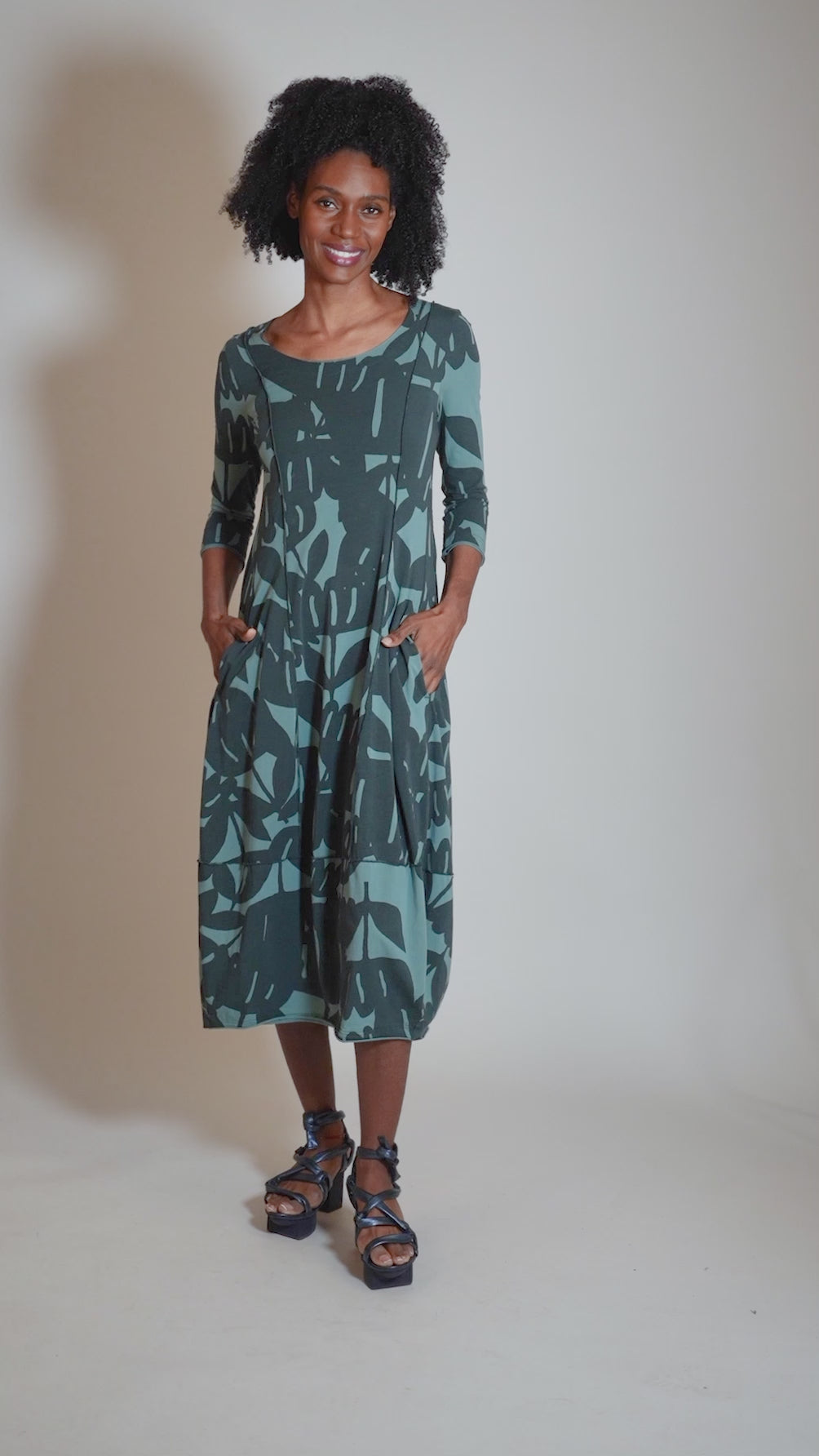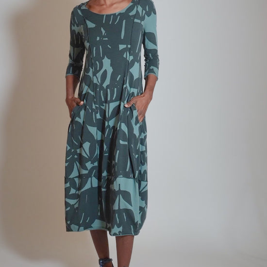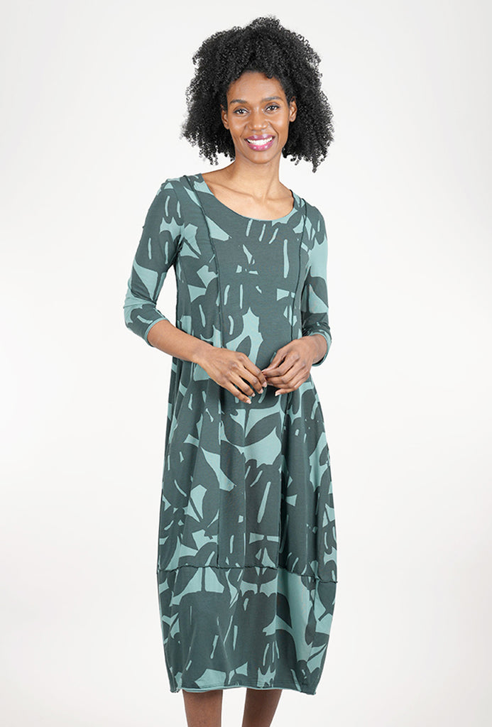 Love this one! This dress has the classic RBL lantern silhouette -- a wide, slightly scooped neckline and a slim fit through the bodice. Dimensional seaming sits at the slightly dropped waistline, and the skirt falls into a full lantern shape before ending at mid-calf. The fabric here is a soft cotton jersey.