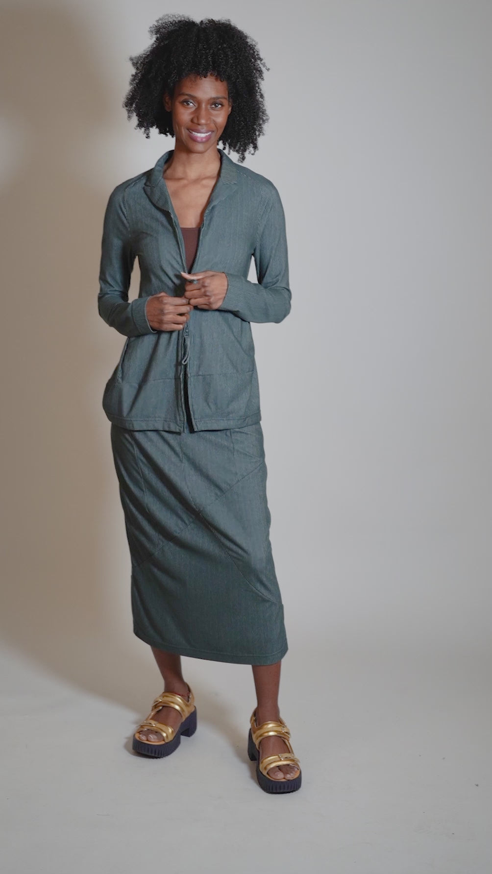 The version of the classic RBL slim skirt is made in a truly terrific new fabric, a cotton blend that's knit in a dimensional ridge pattern, creating a pinstripe effect while also offering excellent drape and comfort! The lean skirt has a subtle drape effect in front with a more tailored rear view with a flat, stretchy waistband. Running true to size