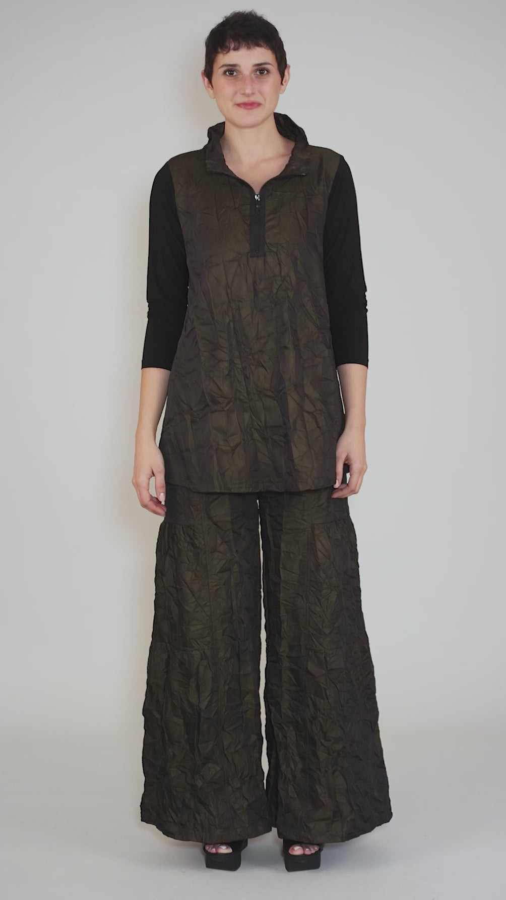 We think Amelia is going to be a hit! Ideal for those sorta-dressy occasions, this Kozan top combines a crinkled, substantial poly blend with an innate sheen through the body, with contrasting jersey sleeves in black. The same lightweight fabric sits in back, adding further ease to the look. The silhouette is a full A-line, with a half-zip placket on the bust and a small Mandarin collar. Running generously.