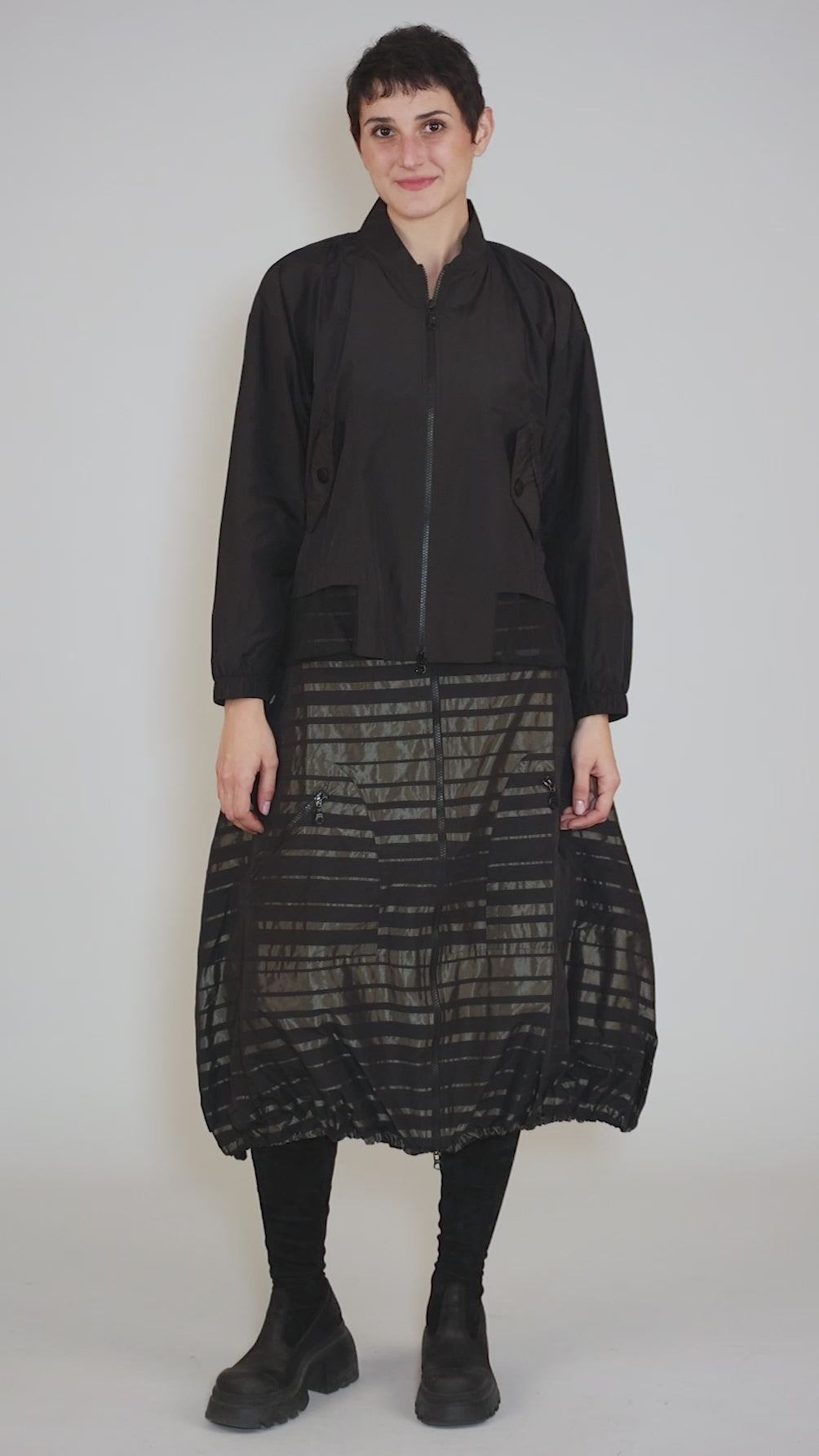 The fabric here is so lightweight and striking, a shimmery nylon with subtle striping. Astrid has a zipper-front closure and a full, bell-shaped silhouette; zip-closure pockets sit on the legs. The waistline is snug, but the elastic in back adds ease to the fit.