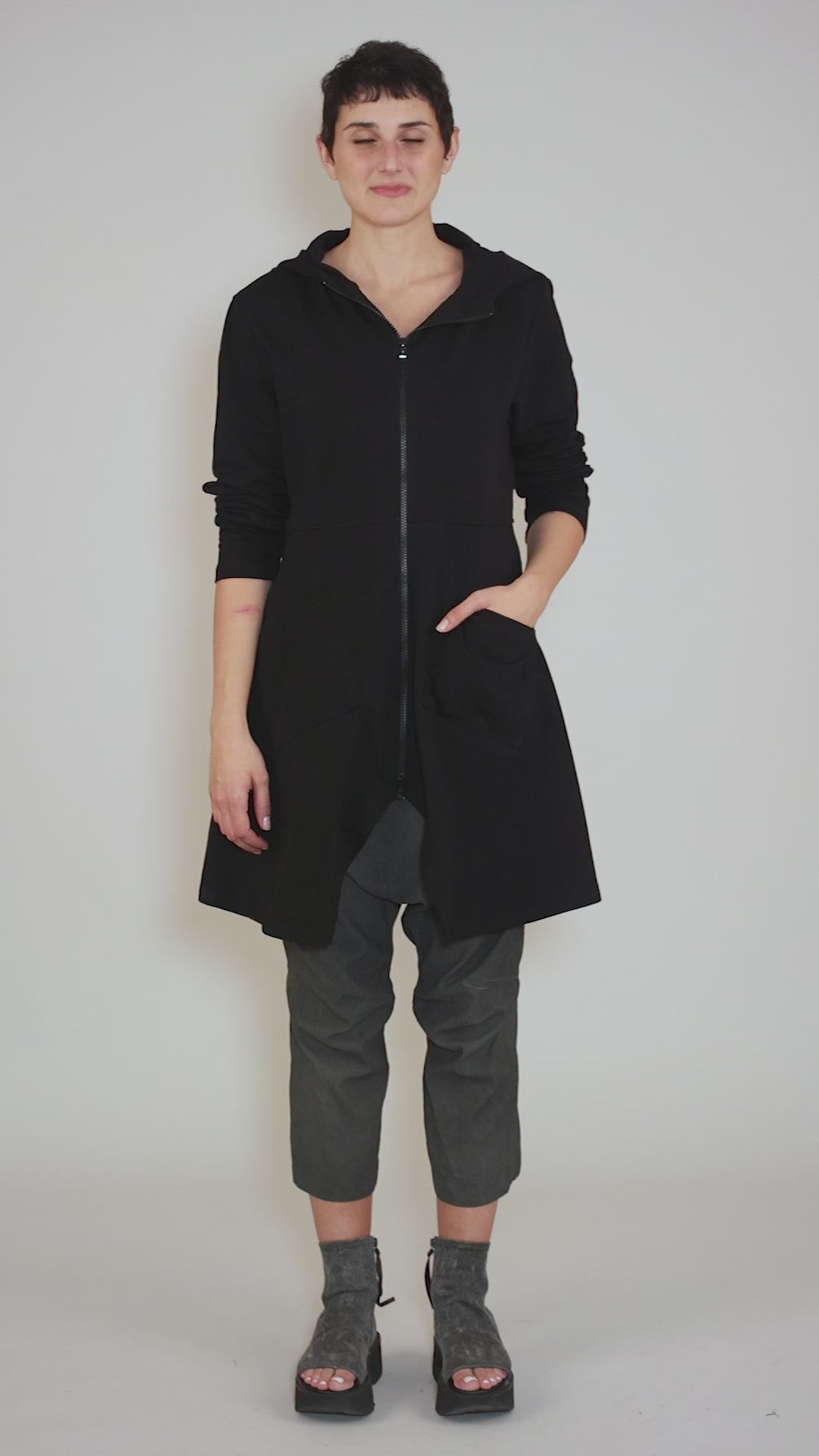 Made in a structured sweatshirt fleece, this flattering hoodie has a set-in shoulder, long sleeves and a zip-front placket; slit pockets sit on the hips. The fit is closer through the bust, before flaring easily through the hips. This is a good one!
