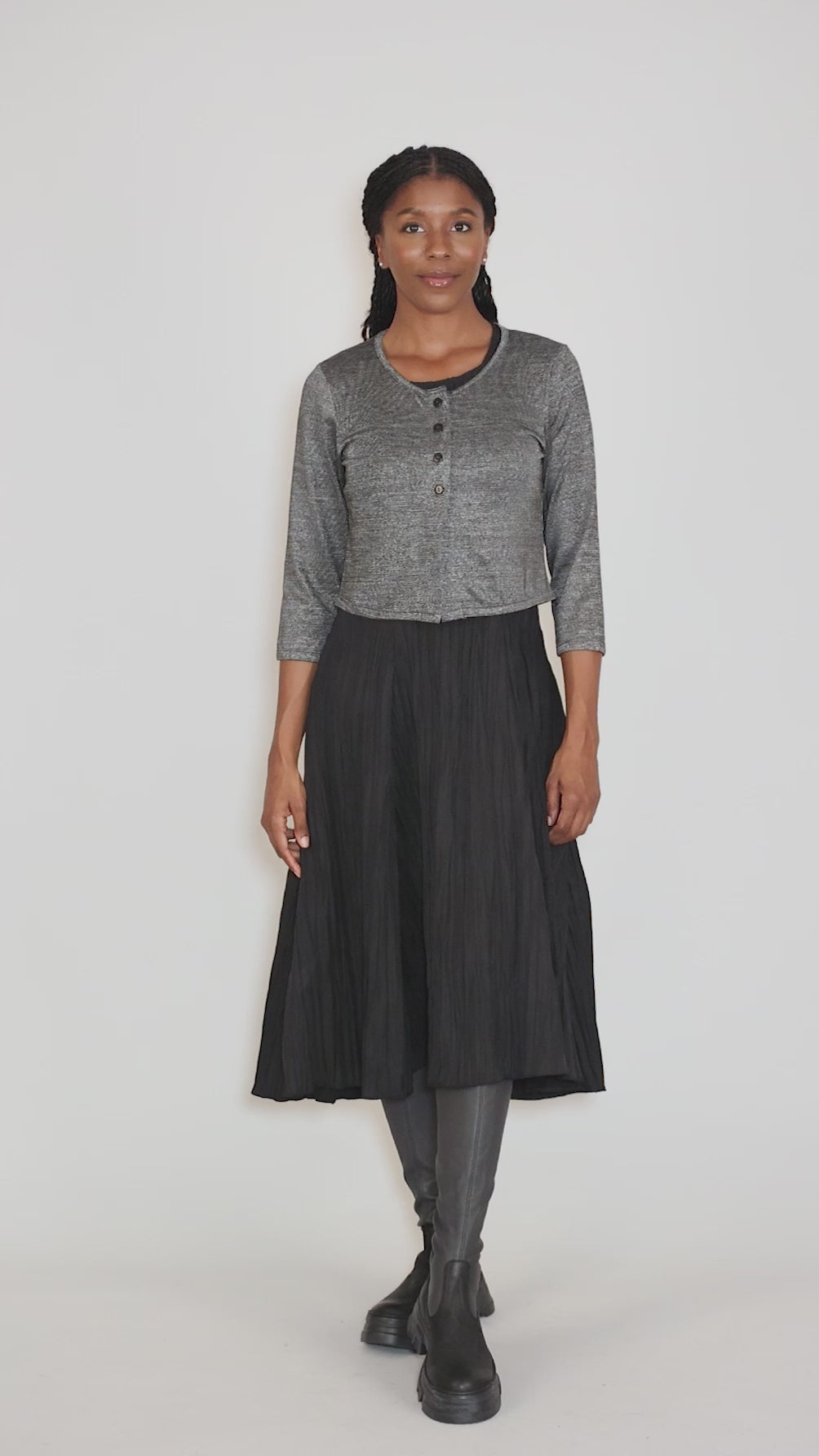 For anyone who's not crazy about her upper arms, a little topper can be a wardrobe workhorse! This cropped layering piece has long sleeves and a crew neckline; a button-front placket adds to its versatility. We especially love the glimmering metallic finish to the fabric. We find Miller runs true to size to slightly small.