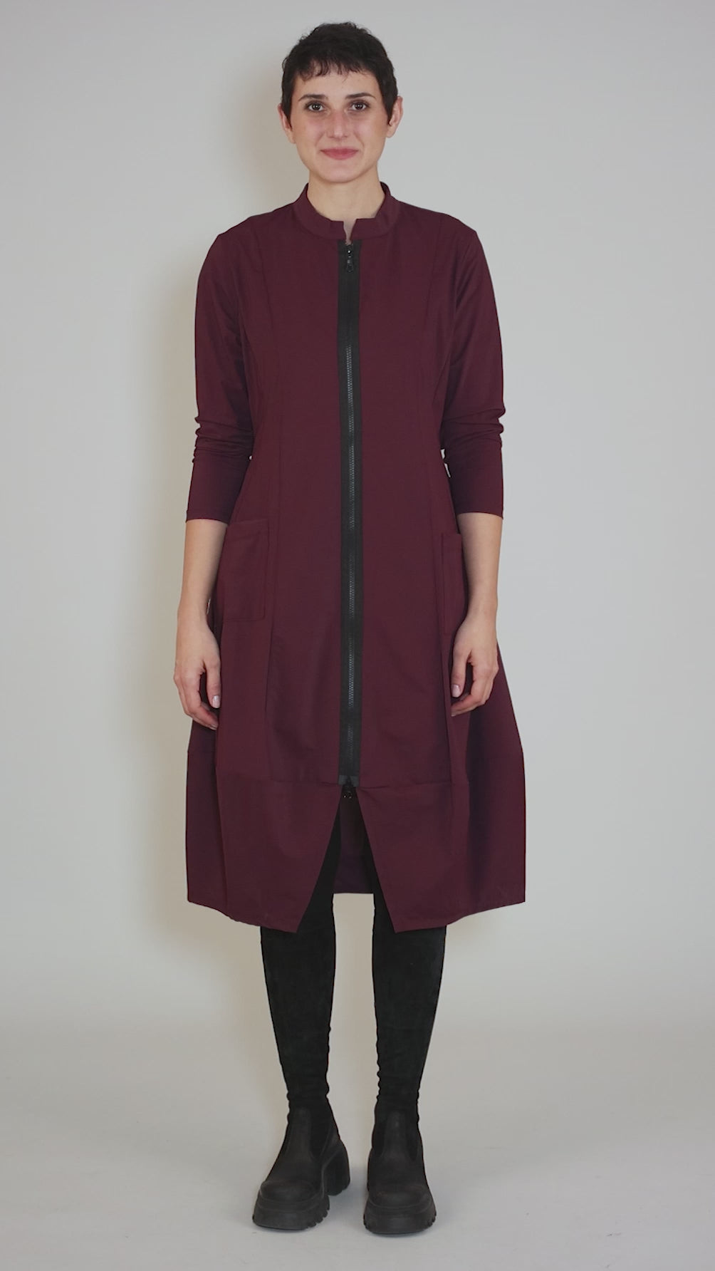 Is is a dress or is it a jacket?! Kozan says it can be both. Made in a lightweight, high-tech blend that has the hand of a performance fabric. Van has bracelet-length sleeves, a short funnel neckline and zipper closure in front. The silhouette is a classic fit-and-flare -- closer through the bust, but easy through the skirt. Slit pockets sit on the hips. We find this is running a bit on the large side.