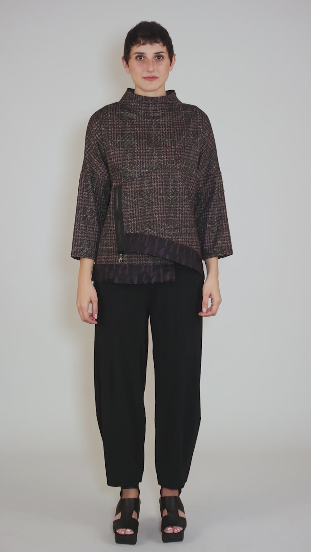 Whim is crafted in a substantial ponte knit, with a set-in shoulder, bracelet-length sleeves and a short funnel neckline. The silhouette is a full A-line, with an overlapping hem detail in front. The fit is relaxed, but the effect is tailored.