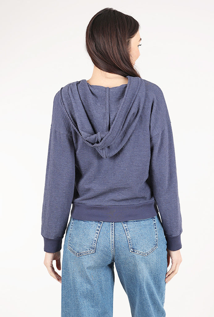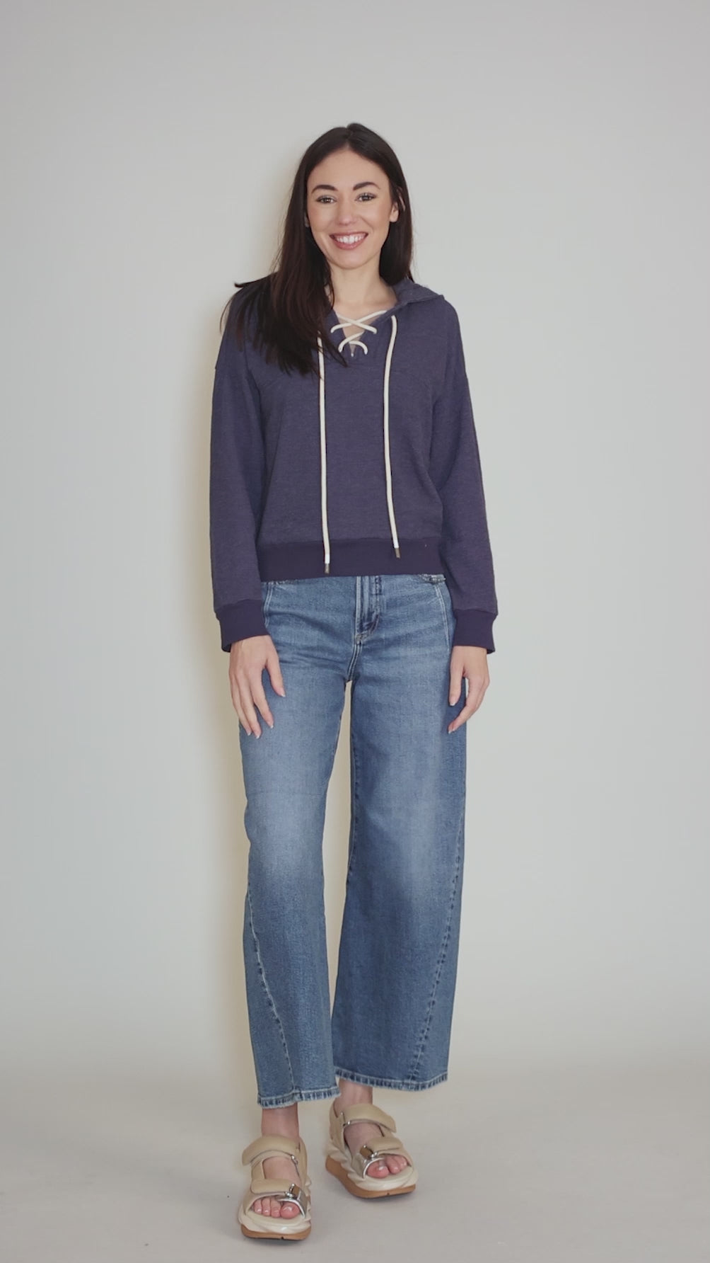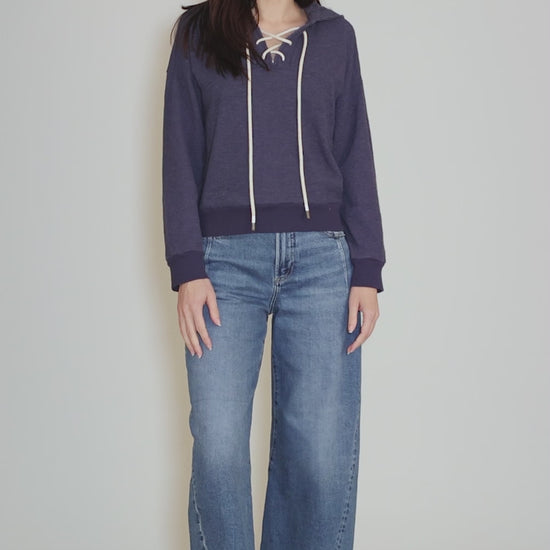 The knit here is so yummy, a luxe cotton blend slub that boasts a dimensional, bumpy weave and a silky feeling on the body. The hoodie itself has a slight drop-shoulder construction, with a deliberately boxy silhouette, ribbed-cuffs on the long sleeves and a hip-skimming length. A lace-up detail at the neckline adds to the fun. Running true to size, but for a slouchier fit, we recommend sizing up.