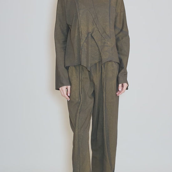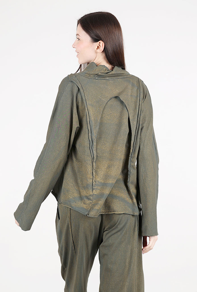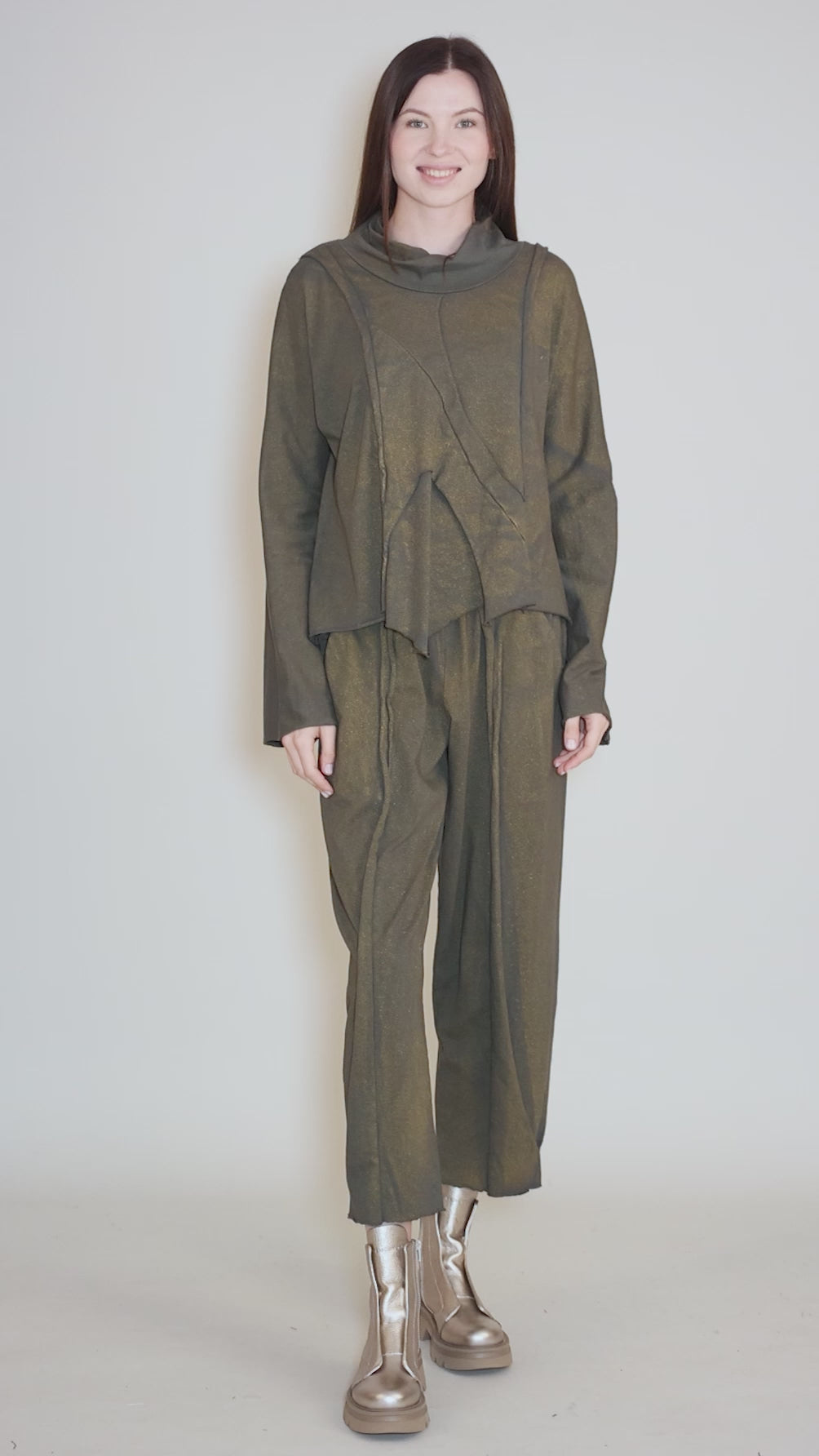 Made in her signature cotton jersey knit, Cynthia Ashby's Laurel top has a soft funnel neckline, with a drop-shoulder construction and deep dolman sleeves. Layered appliques of fabric and an uneven hemline add to the fun. But the headline here is the hand-painted finish, a shimmering gold over army green. Super special!