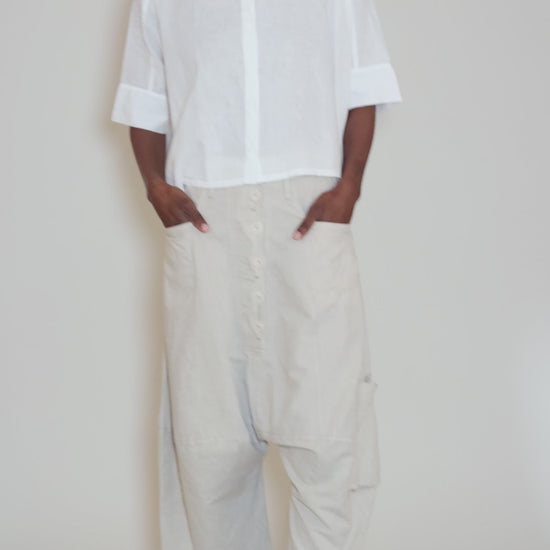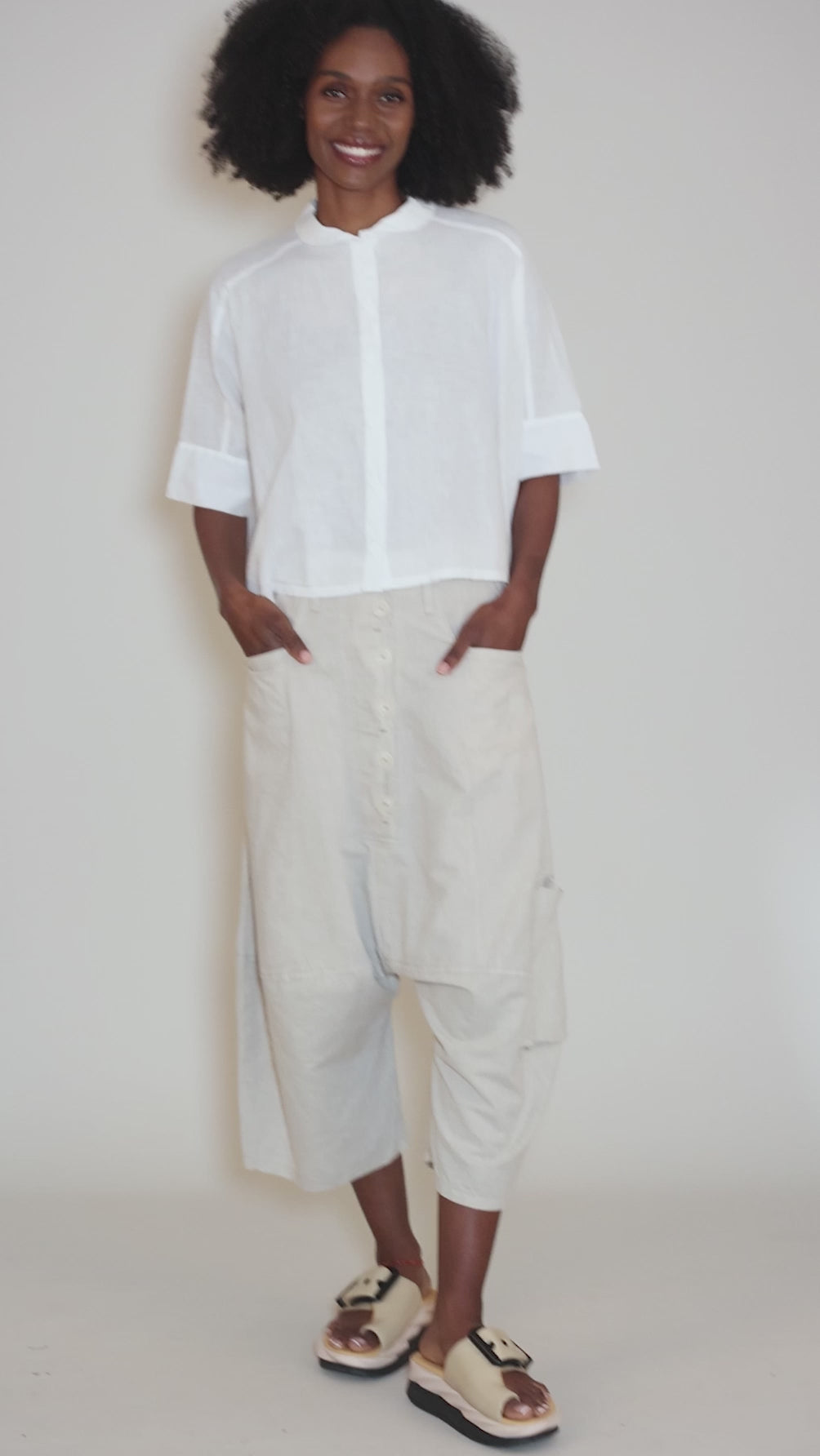 This prim little blouse is done in a soft, woven linen-cotton blend. It has a button-front placket, with a drop-shoulder construction and a deliberately boxy silhouette. Please note that the fabric is a bit sheer; we're showing this layered over a camisole. The fit is relaxed and easy.