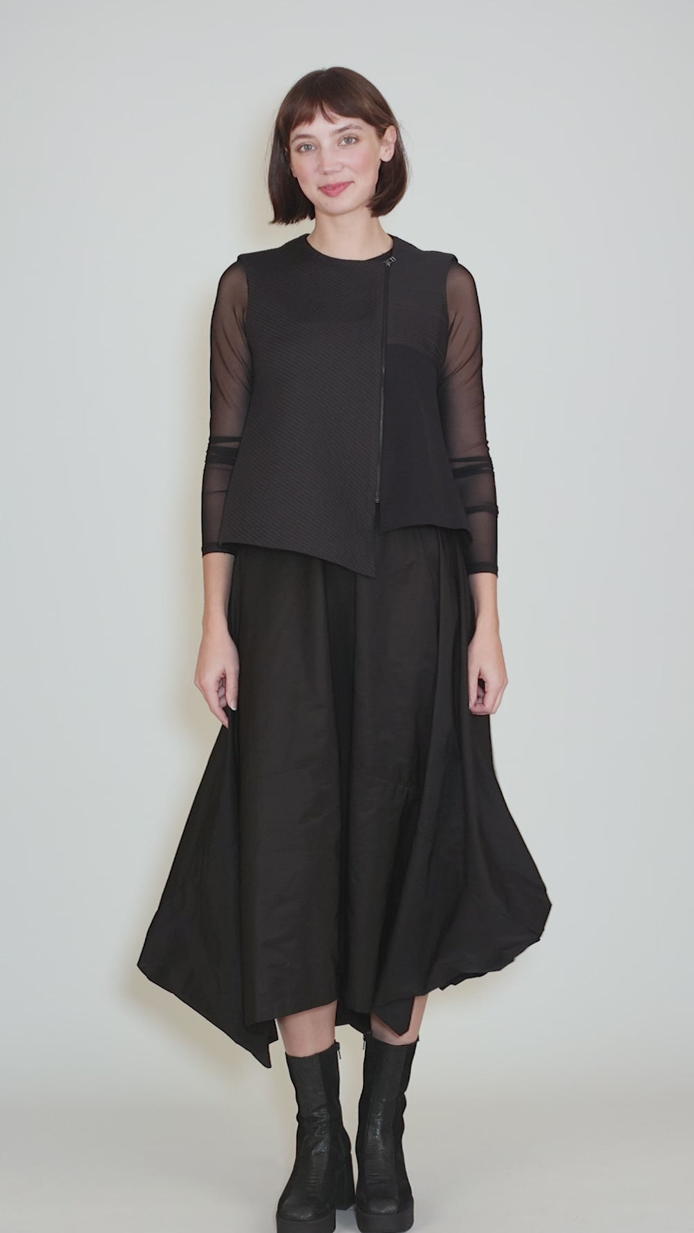 Jari has so many layering possibilities! Wear it as a waistcoat under a blazer, for a night out over a semi-sheer mesh tee, or over a crisp white shirt for the office. It's done in a lightweight poly, with the sheen and structure of nylon, with an off-center zip placket and contrast accents on side. The hip-skimming length adds to its versatility. Running true to size to slightly small.