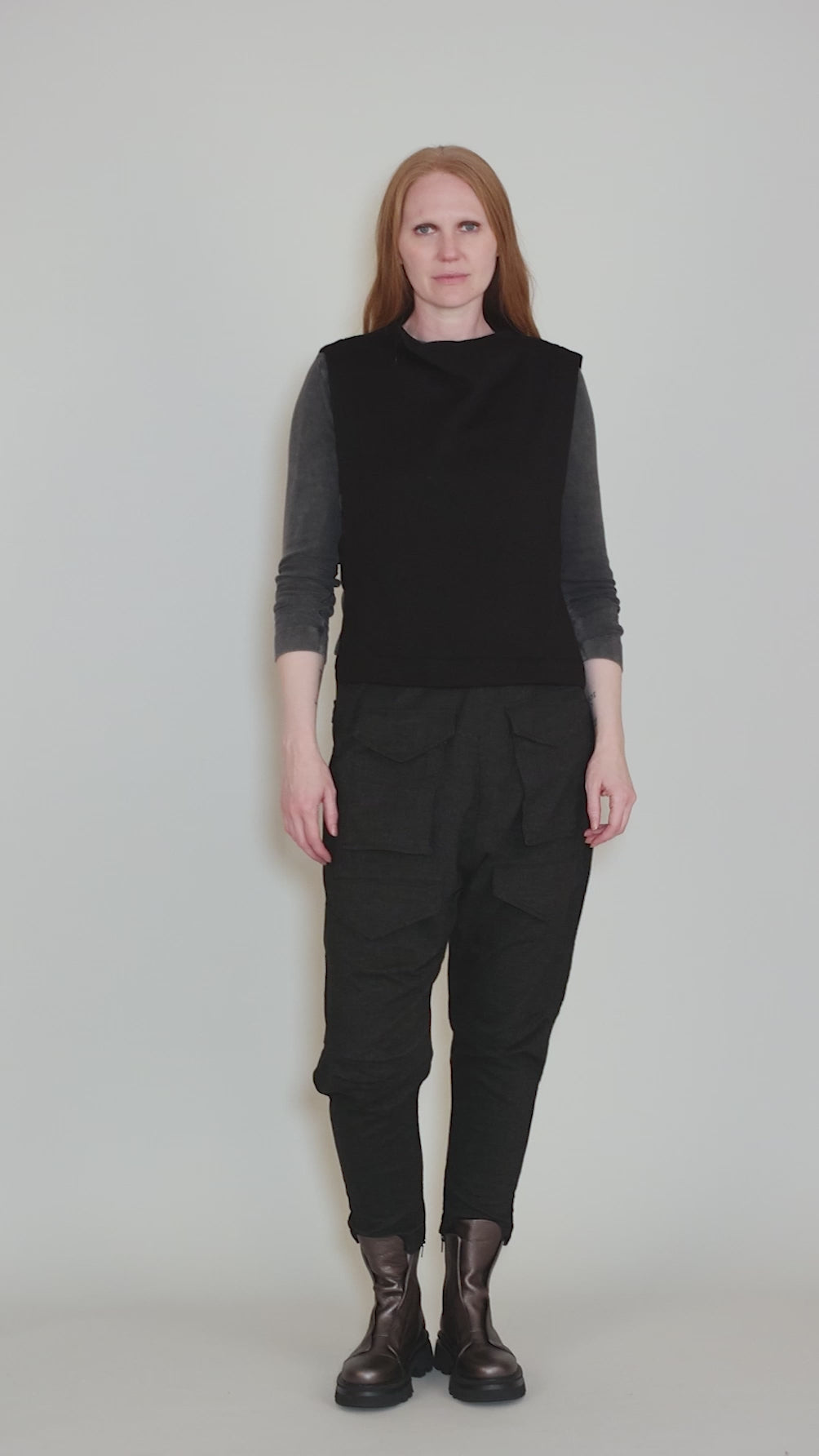 Such a cool layering piece! Done in a mid-weight viscose-knit blend, the Vaseg vest has a draped neckline and open sides that are connected by a buttoned strap. The fit is relaxed and a bit oversized, but we like the piece best when it's worn slouchily, so sizing down isn't automatically recommended.