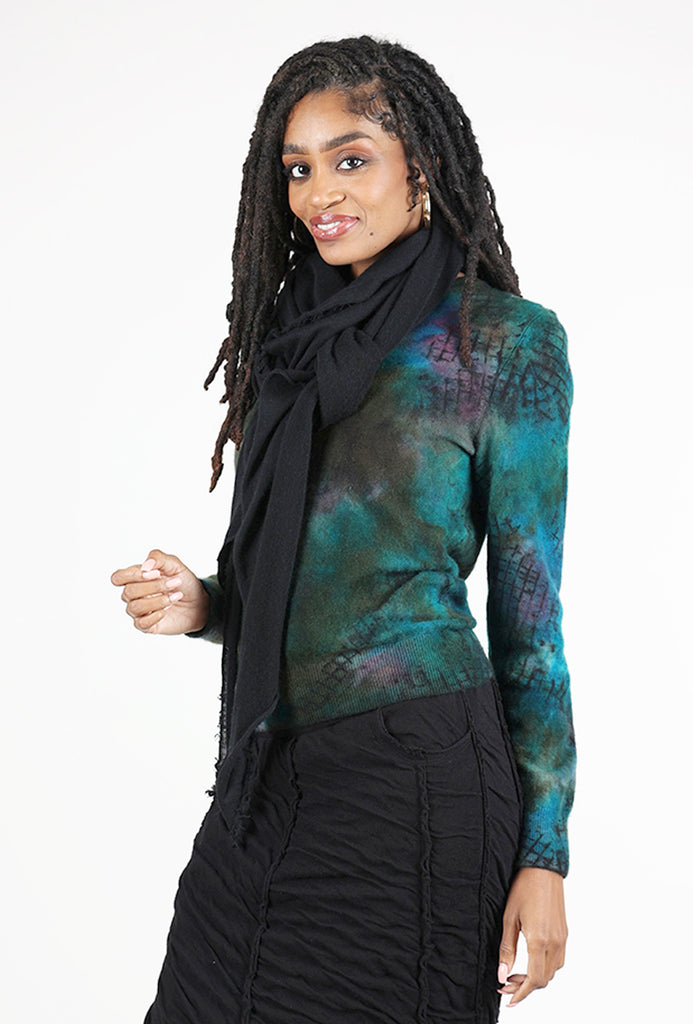 The ultimate in luxury and melt-in-your-hand texture, Grisal scarves are knit on the bias, are oblong and have distressed edges. They look wonderful when worn loose, left to fall where they please.