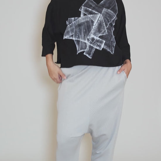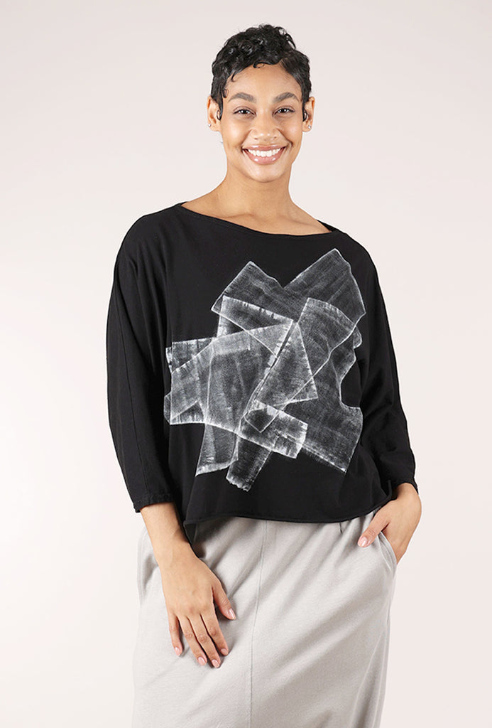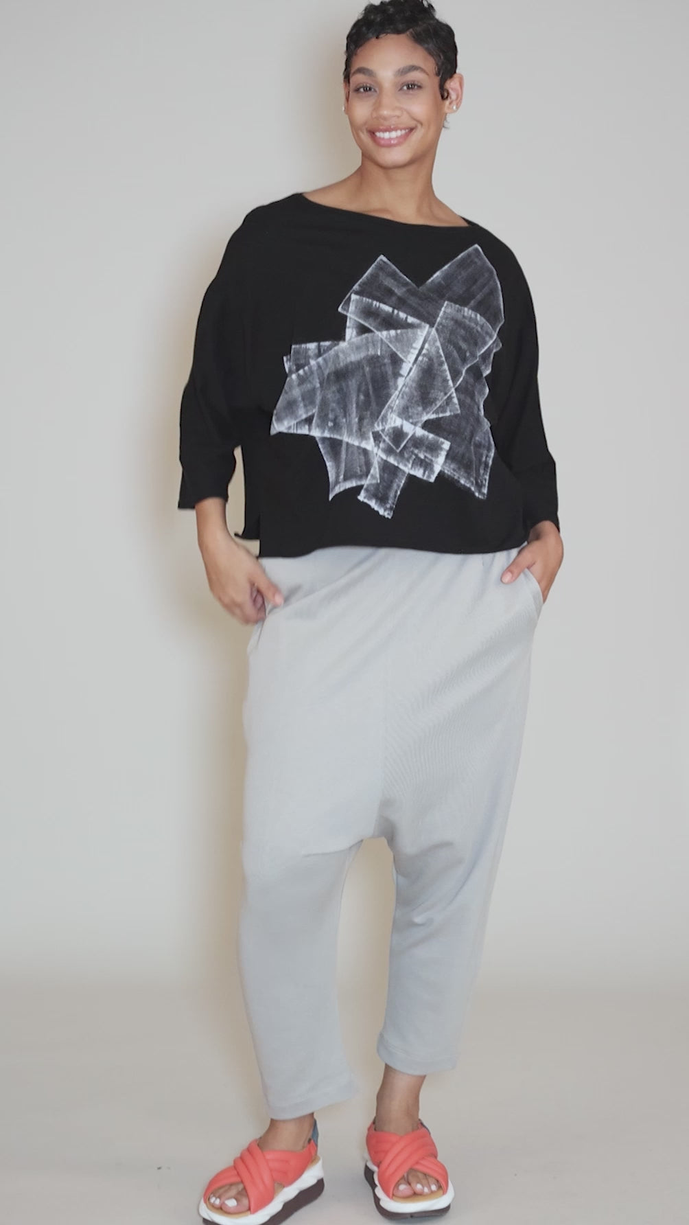 A simple tee from Cynthia Ashby, Luna has a wide boat neckline and a drop-shoulder construction. The bracelet-length dolman sleeves are full and airy, as is the boxy silhouette. The fabric here is terrific, a soft cotton jersey knit, with a hand-screened graphic. Runs on the large side.