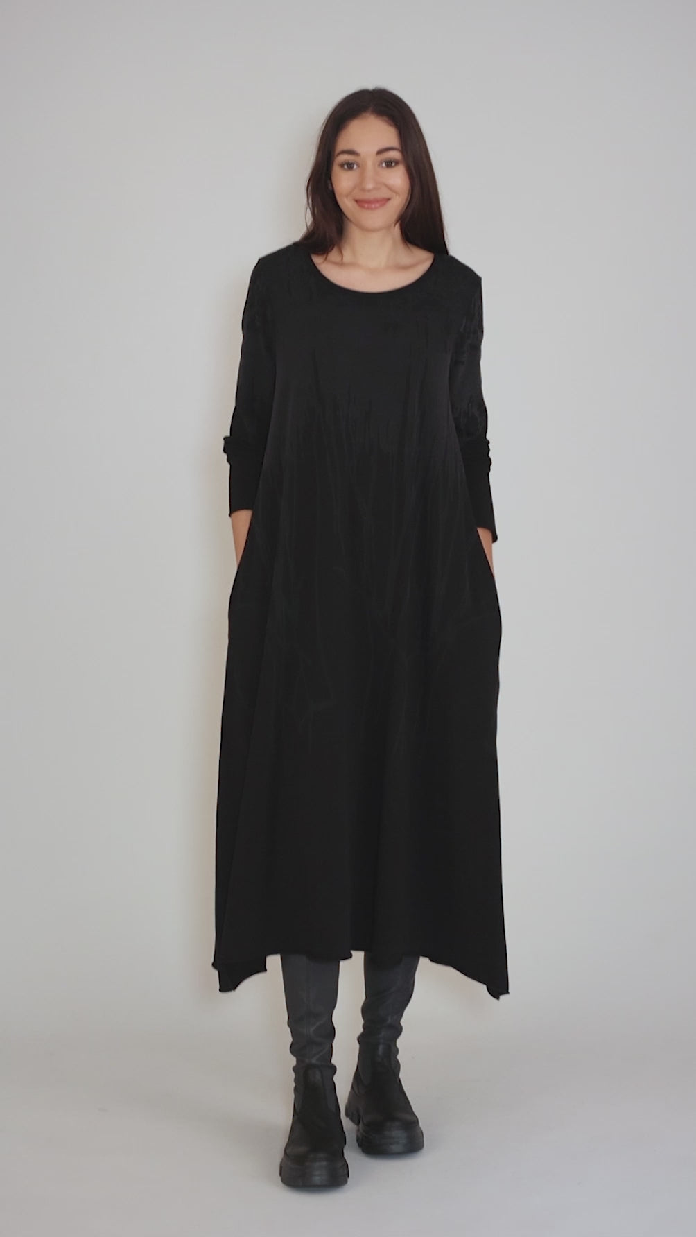 Made in a soft cotton jersey blend, Lilith has a rounded neckline, a set-in shoulder and long sleeves. The silhouette is a very full A-line, and the print, a deep charcoal on the black background, extends across the front and back and down each arm. The fit here is quite relaxed!
