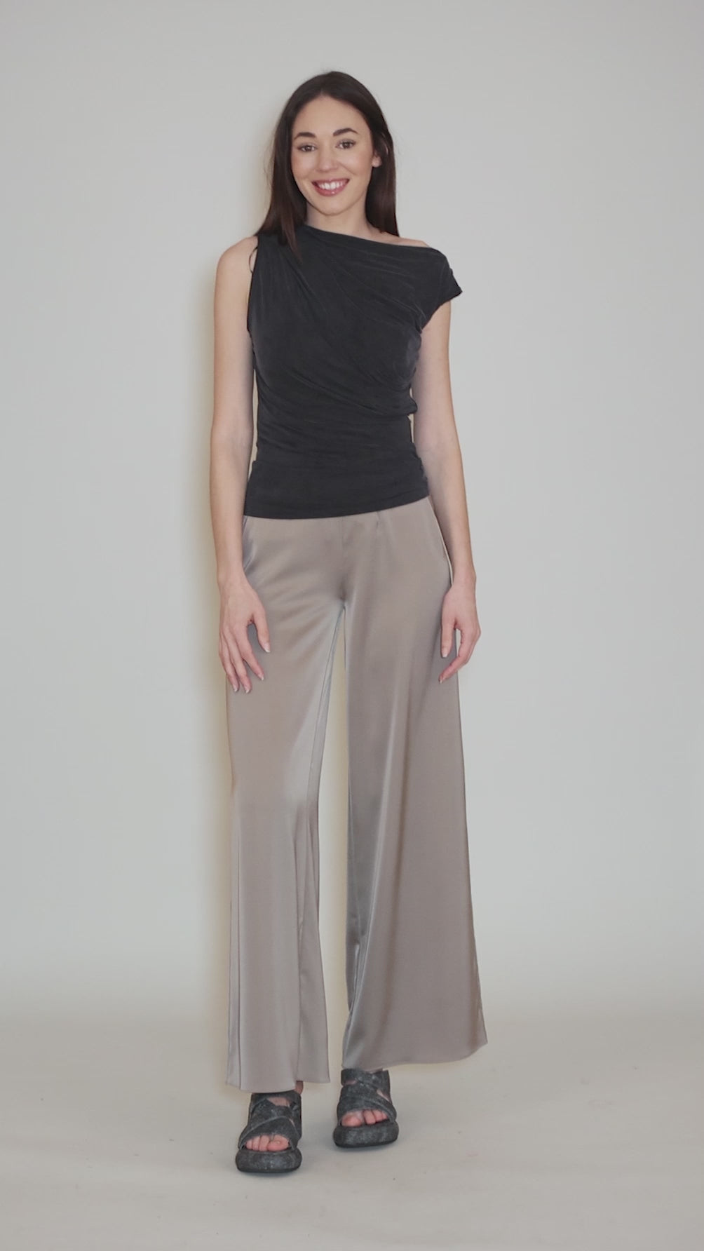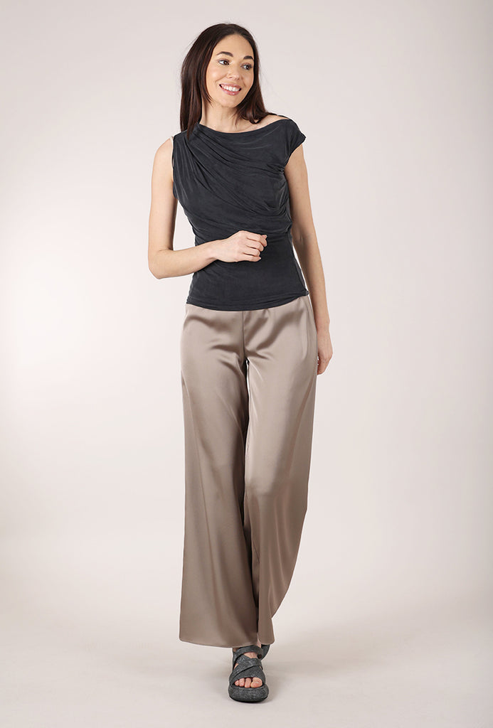 Maddy is crafted in a Cupro blend, with a smooth, almost sueded, hand. She has a body-conscious silhouette, with shirred sides, and the wide neckline can be worn as a cowl or off the shoulder. We find this is running on the small side.