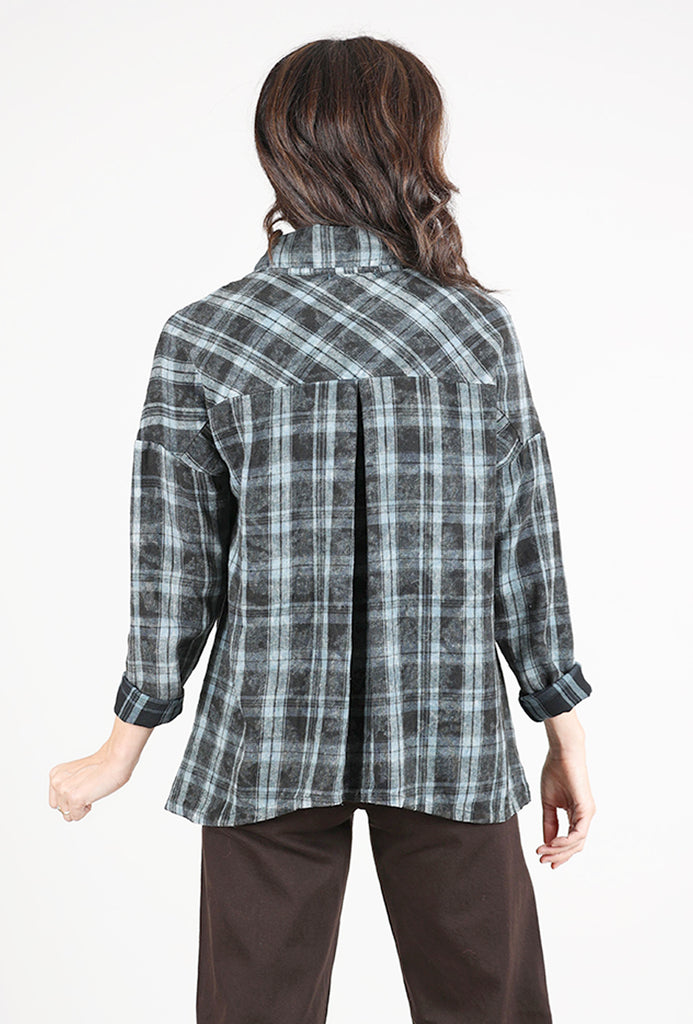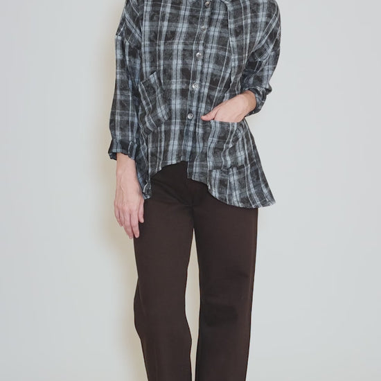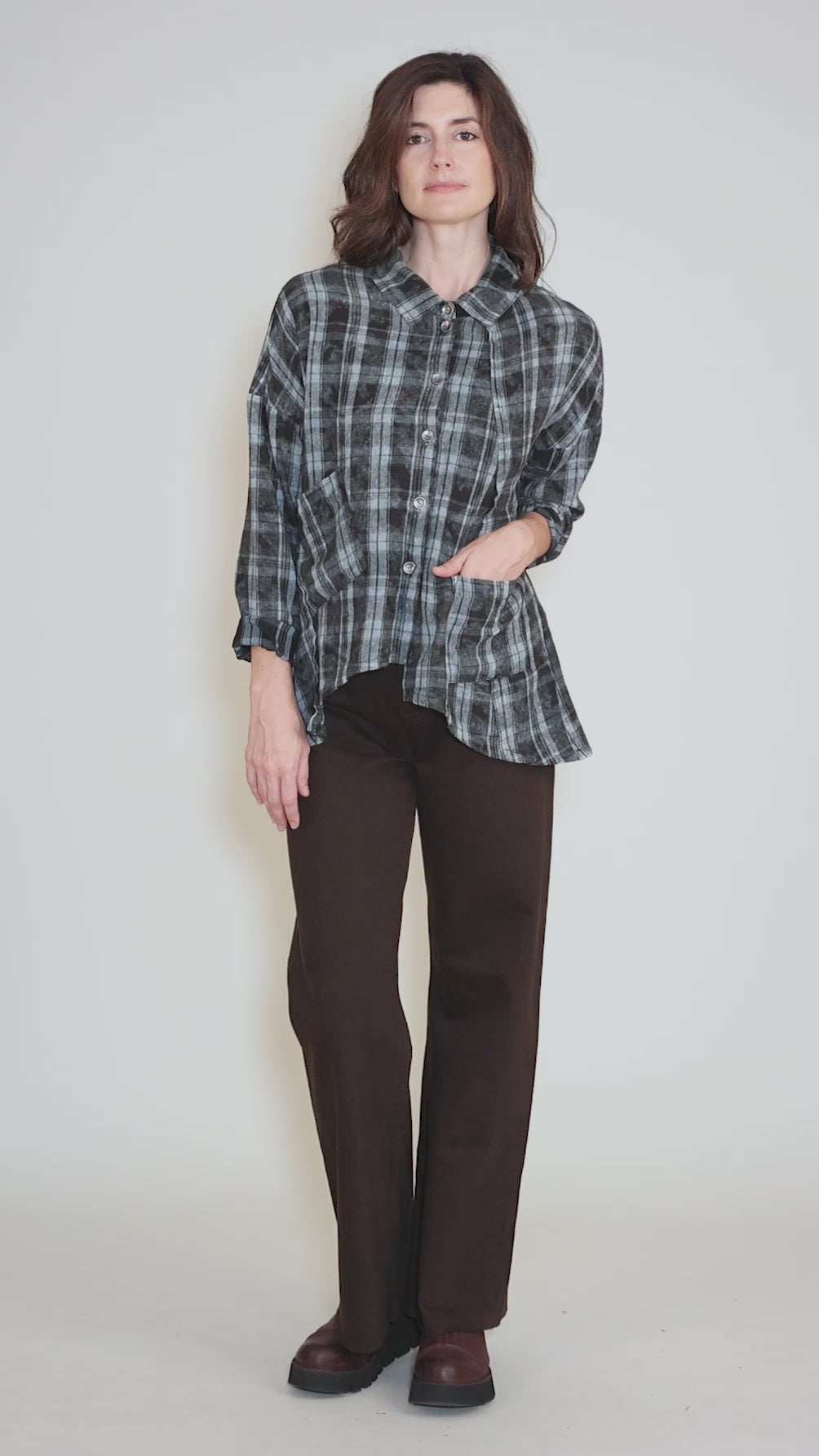 Made in a soft cotton flannel, Mara has a button-front placket, with a small shirt collar and a slight drop-shoulder construction. The silhouette is a full A-line, with an asymmetric hemline and mis-matched patch pockets in front. The fit is relaxed, but not hugely oversized.