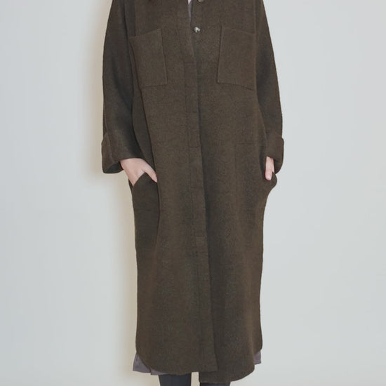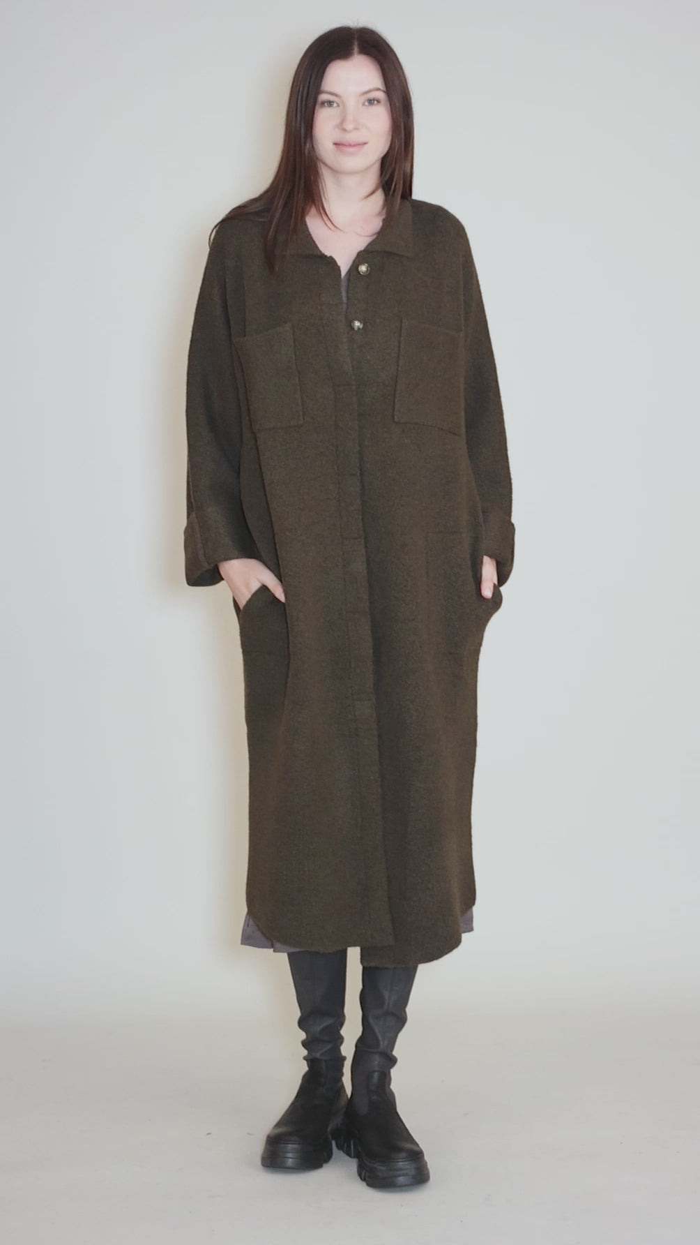 The fabric here feels so luxurious, a densely knit acrylic blend with absolutely no itch factor. This oversized cardie-coat has a hidden button-front placket, with a small shirt collar and extra-long sleeves. The body is quite long and a bit oversized.