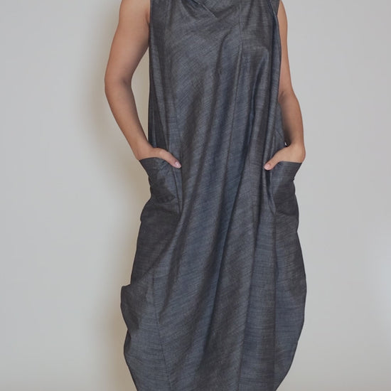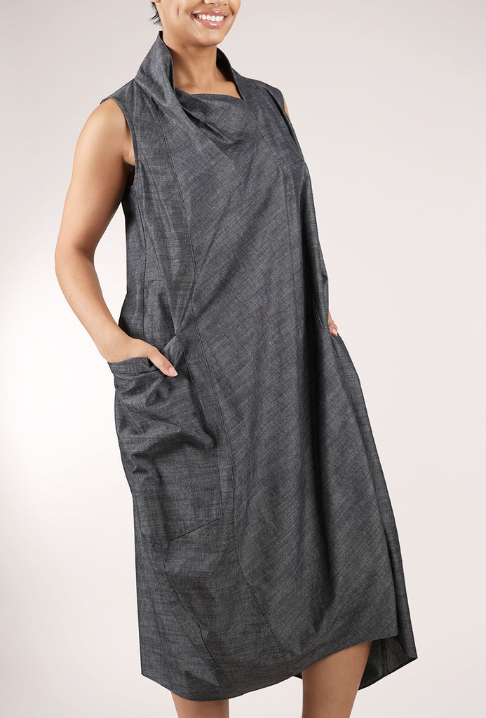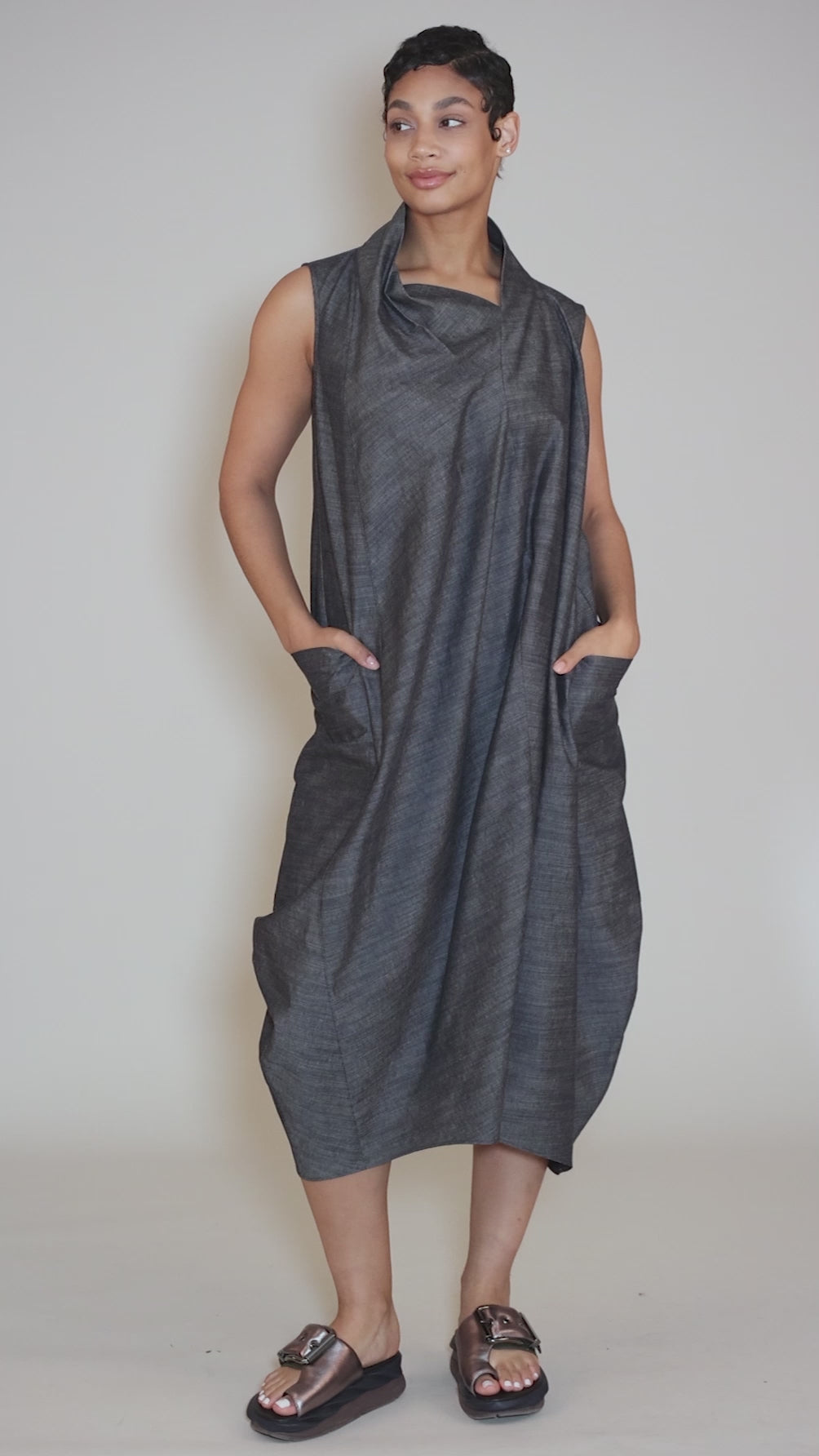 Made in a lightweight, heathered cotton denim with innate structure, Merete has a draped neckline and an off-center tuck detail on one side that sets up a dramatic fullness to the lantern-shaped silhouette. Patch pockets sit on the sides. Running a bit on the large side.