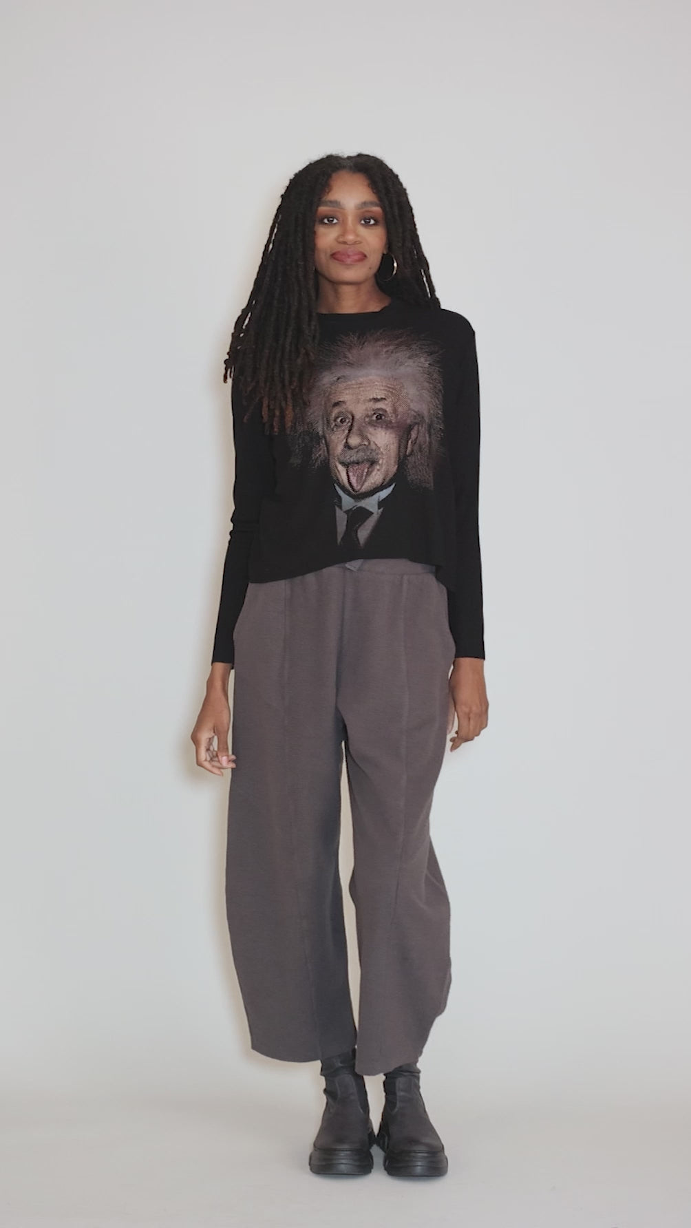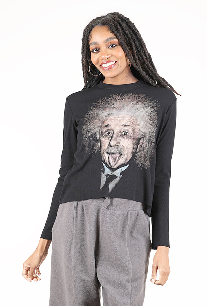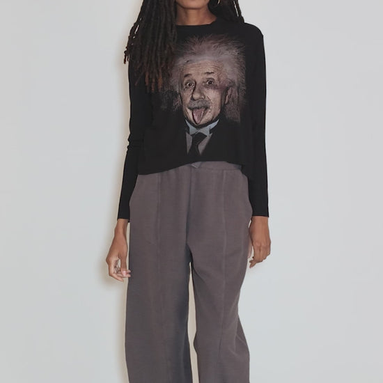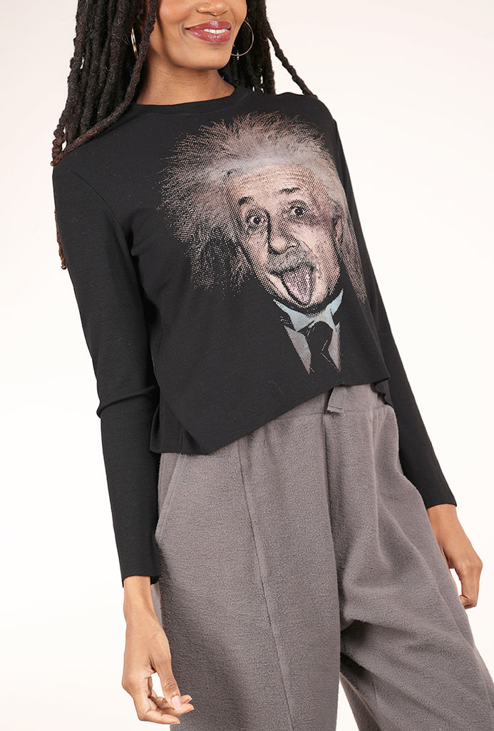 This slightly cropped tee has a crew neckline and long sleeves. The fabric here is really lovely, a vertically textured knit with excellent drape, and features a hand-screen print of Albert Einstein. Please note that due to the artisan nature of these garments, no two are exactly alike. We find this is running true to size.