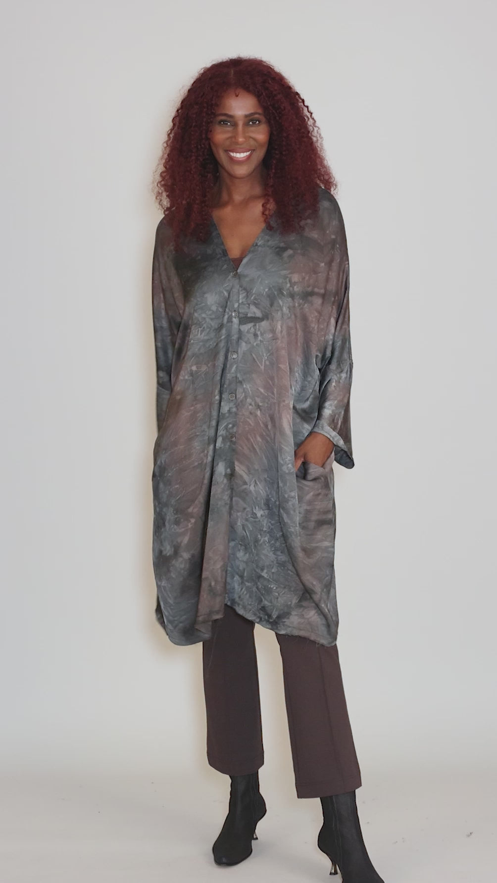 Crafted in a woven viscose with the hand and sheen of silk, this oversized piece has been hand-dyed to rather glamorous effect. It has a V neckline, with a drop-shoulder construction, a button-front placket and a cocoon-shaped silhouette. Slit pockets sit on the hips. While Sanctamuerte offers a matching pant for a Hollywood vibe, we also like this piece back to trim trousers and denim. Running quite large.