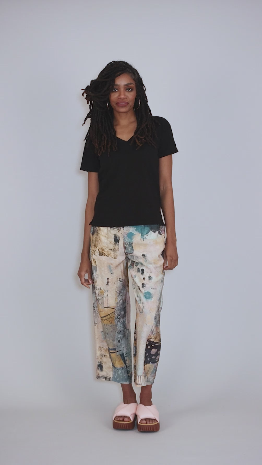 This short-sleeved T-shirt is done in a soft cotton slub knit; it has a V neckline and a relaxed fit. The silhouette is slightly cropped, making this a terrific partner back to more complicated bottoms. Runs true to size.