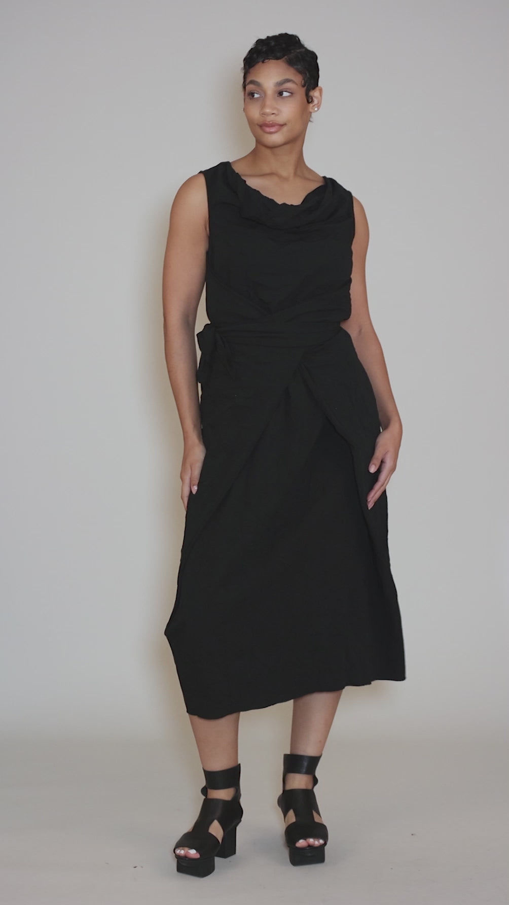 Mona can dress up or down with ease! She's made in a lightweight, crinkled woven with an innate structure, with a V neckline, bra-friendly shoulders and an A-line silhouette. The dress has two large fold/ribbon details on each side, which can be wrapped around the waist in front or in back, creating an architectural envelope effect. We find this is running a bit on the large side.