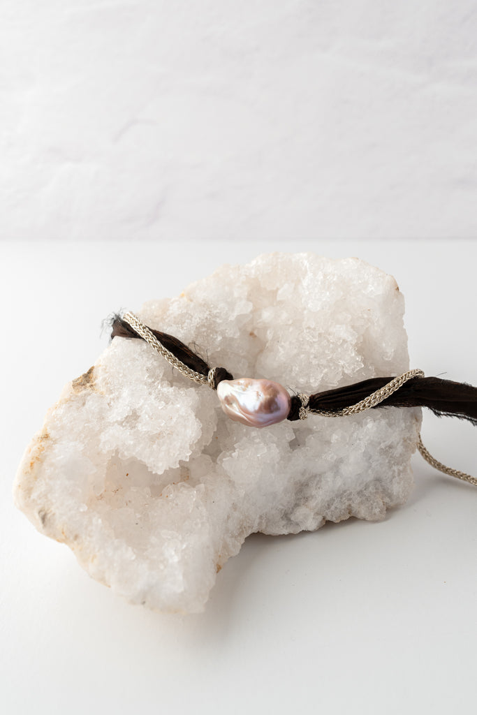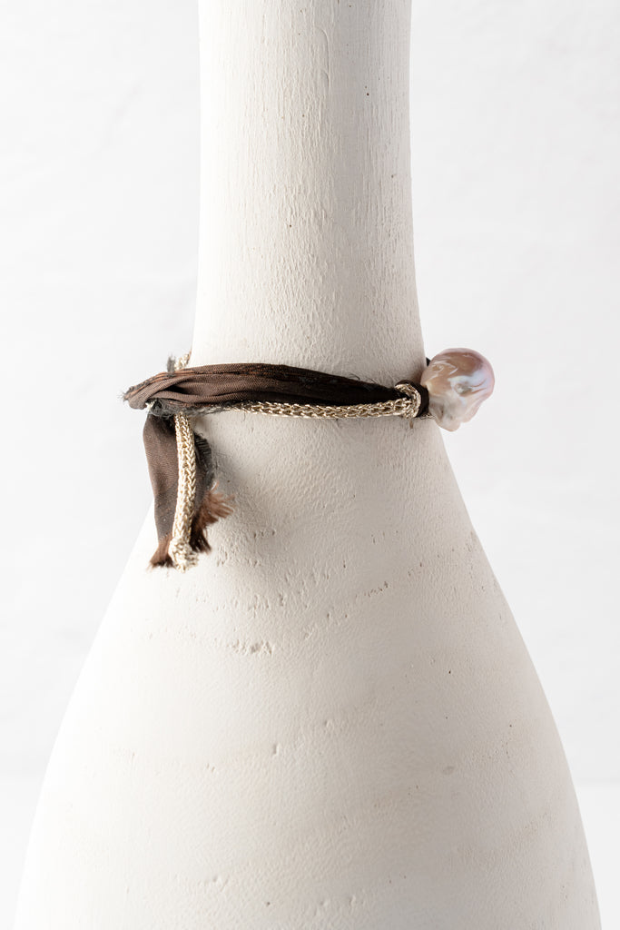A soft, effortless wrap-style bracelet featuring a single luminous baroque pearl. The combination of woven metallic cord and dark, hand-torn fabric gives this piece an organic, modern-bohemian feel—lightweight, textured, and uniquely elegant.