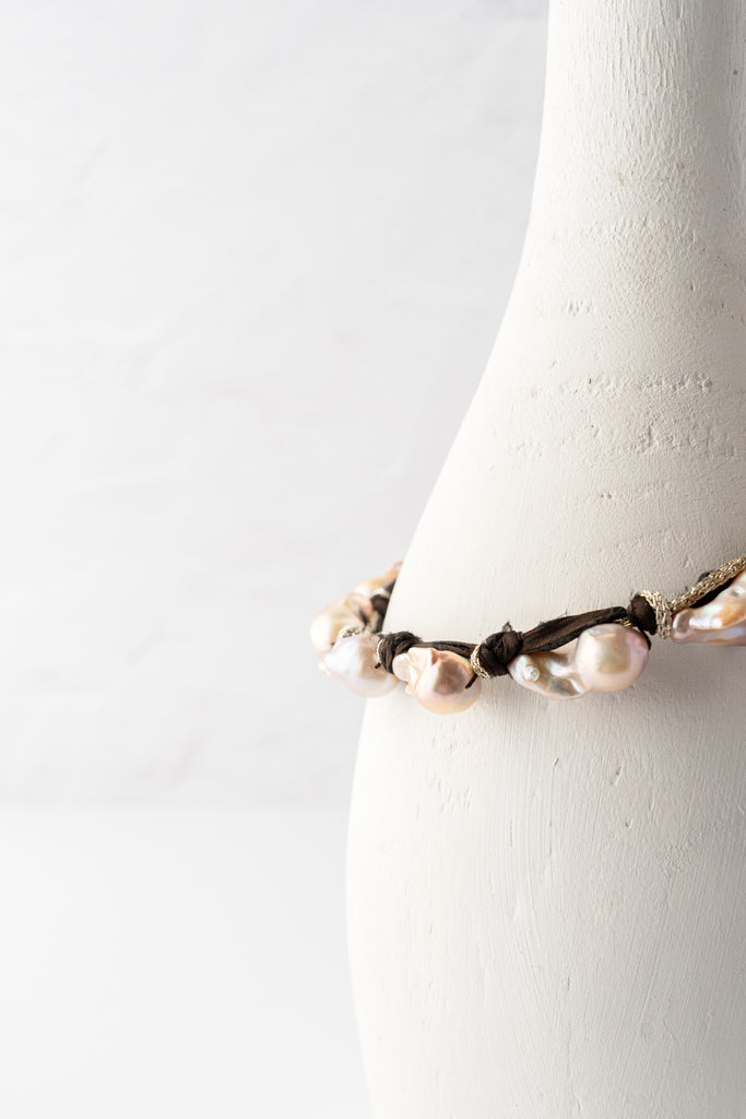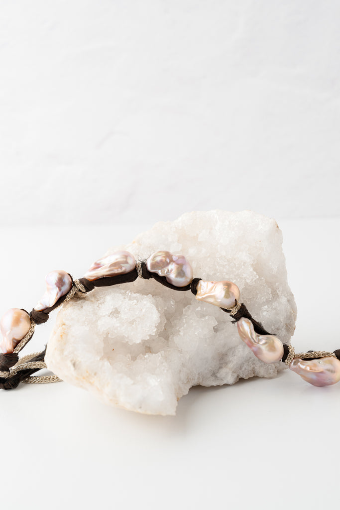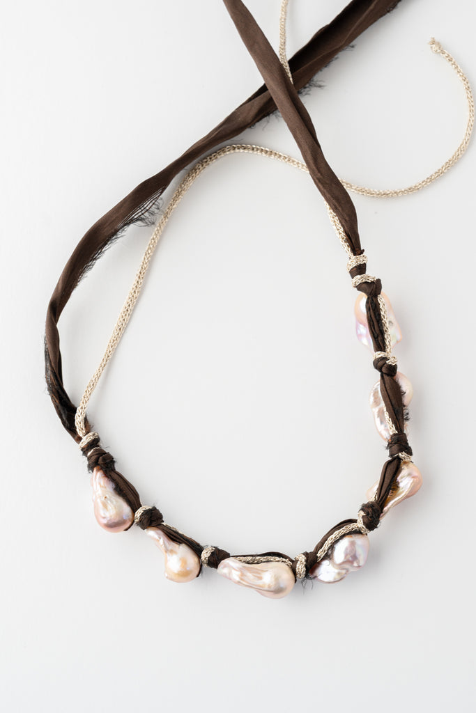 A striking, free-spirited necklace featuring a row of luminous baroque freshwater pearls, each one uniquely shaped and full of natural iridescence. The pearls are hand-tied along a rich brown fabric strand, intertwined with metallic woven cord for subtle shimmer and texture. Earthy, soft, and artful, the Morgan Necklace brings an effortless bohemian elegance to any look.