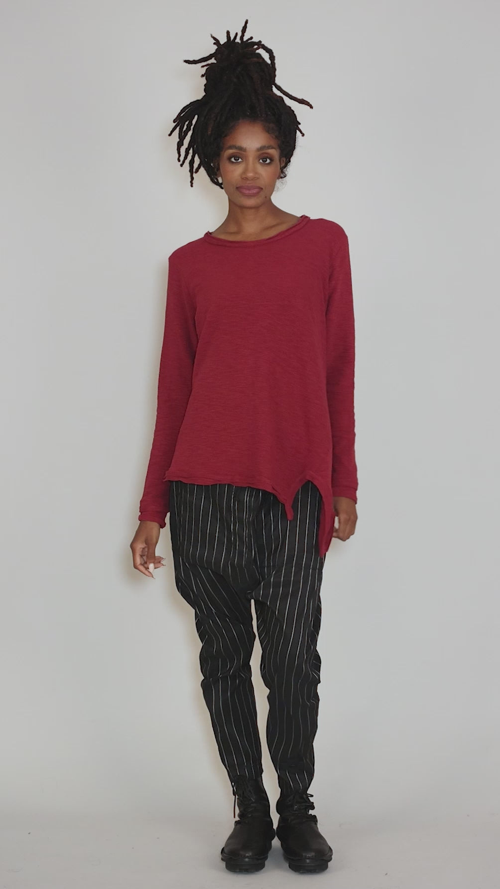 The deceptively simple tunic packs a lot of nice Moyuru details into its sculptural silhouette. It's made in a nicely textured cotton knit blend, with a rounded neckline, a set-in shoulder and long sleeves. The body is asymmetric, with a side slit on one hip and rolled edges at the hemlines. The fit is relaxed and easy.