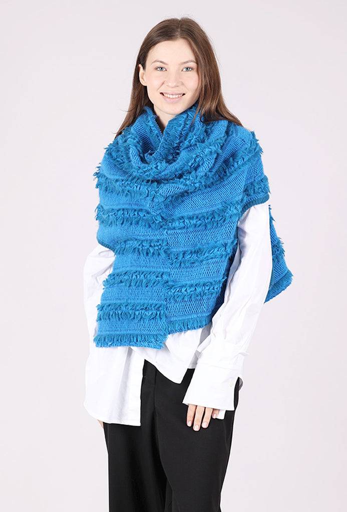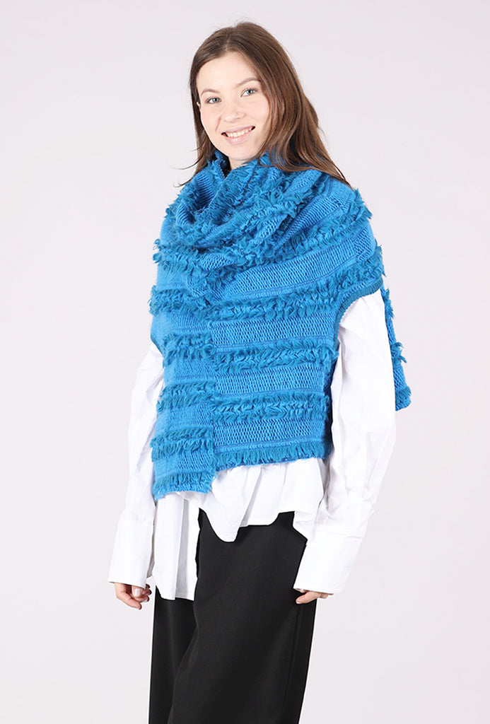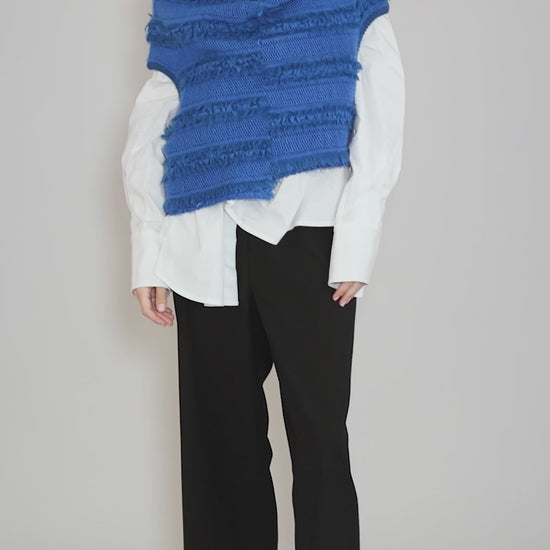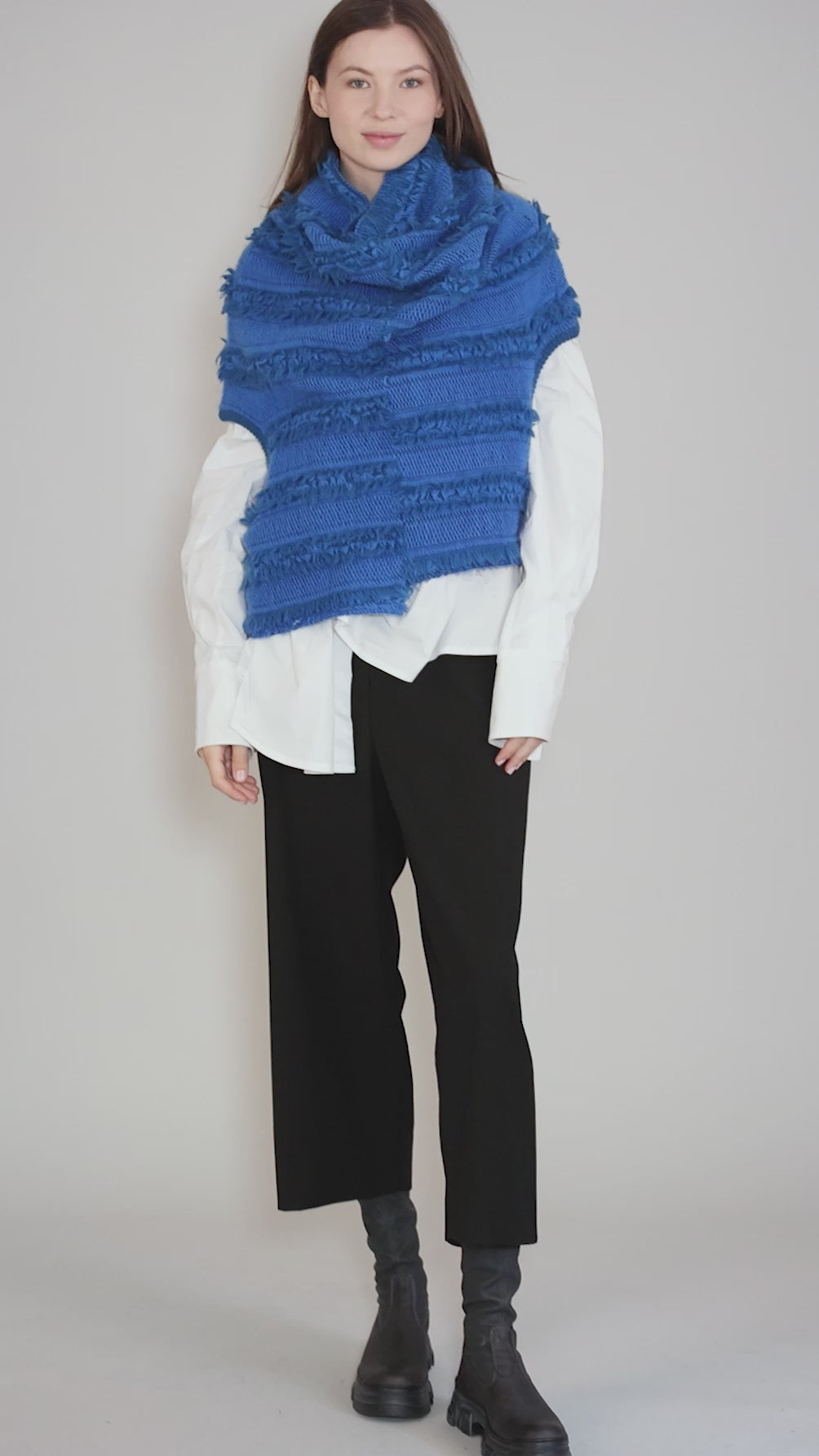 This dimensionally knit sweater vest has a dramatically draped neckline, with deep armholes and an elongated silhouette that's intended to scrunch up through the midsection. Such a fun color for layering!