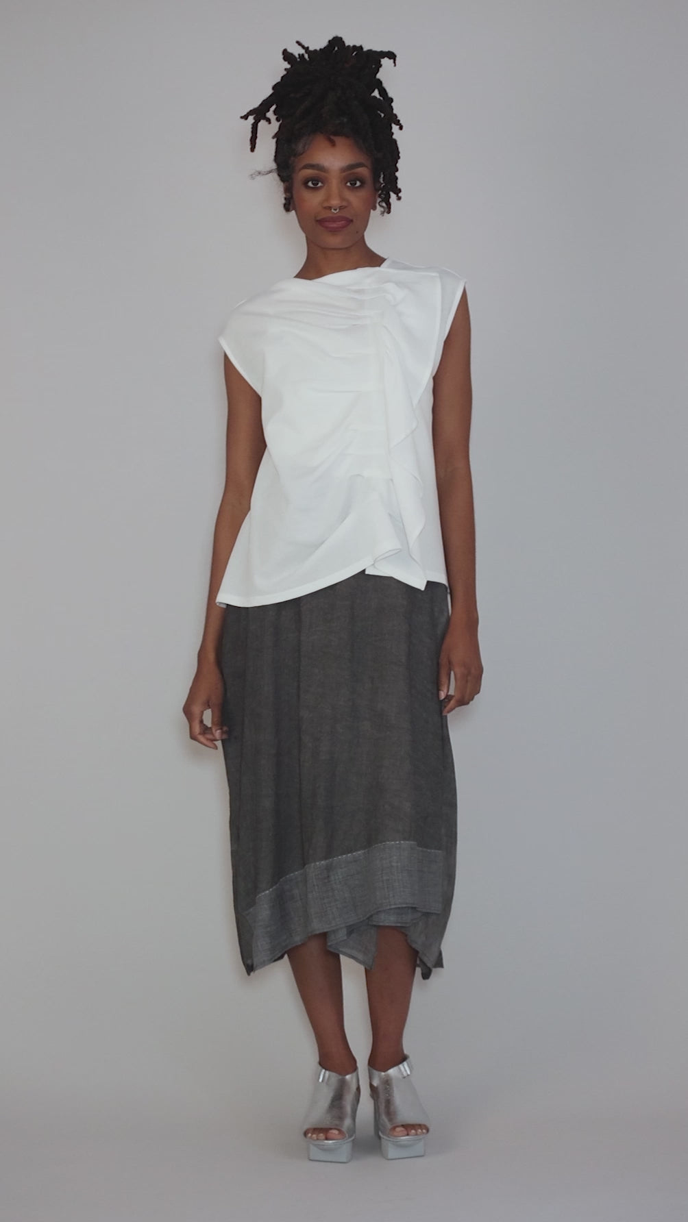 We absolutely love this top! It's done in a luxurious cotton jersey with a bit of stretch. It has a drape neckline and an off-center shirred detail that sets up an extravagant ruffle detail. The silhouette is a gentle A-line, with an asymmetric hemline and extra room in back for added swing.