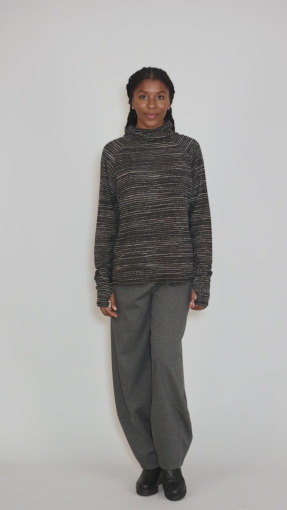 Moyuru is showing this turtleneck under most of their dresses, tops and sweaters this season! It's done in a smooth cotton jersey blend, with long raglan sleeves complete with thumb holes. Please note that while Moyuru's clothes are usually very generous in fit, this piece is running a bit more true to size.