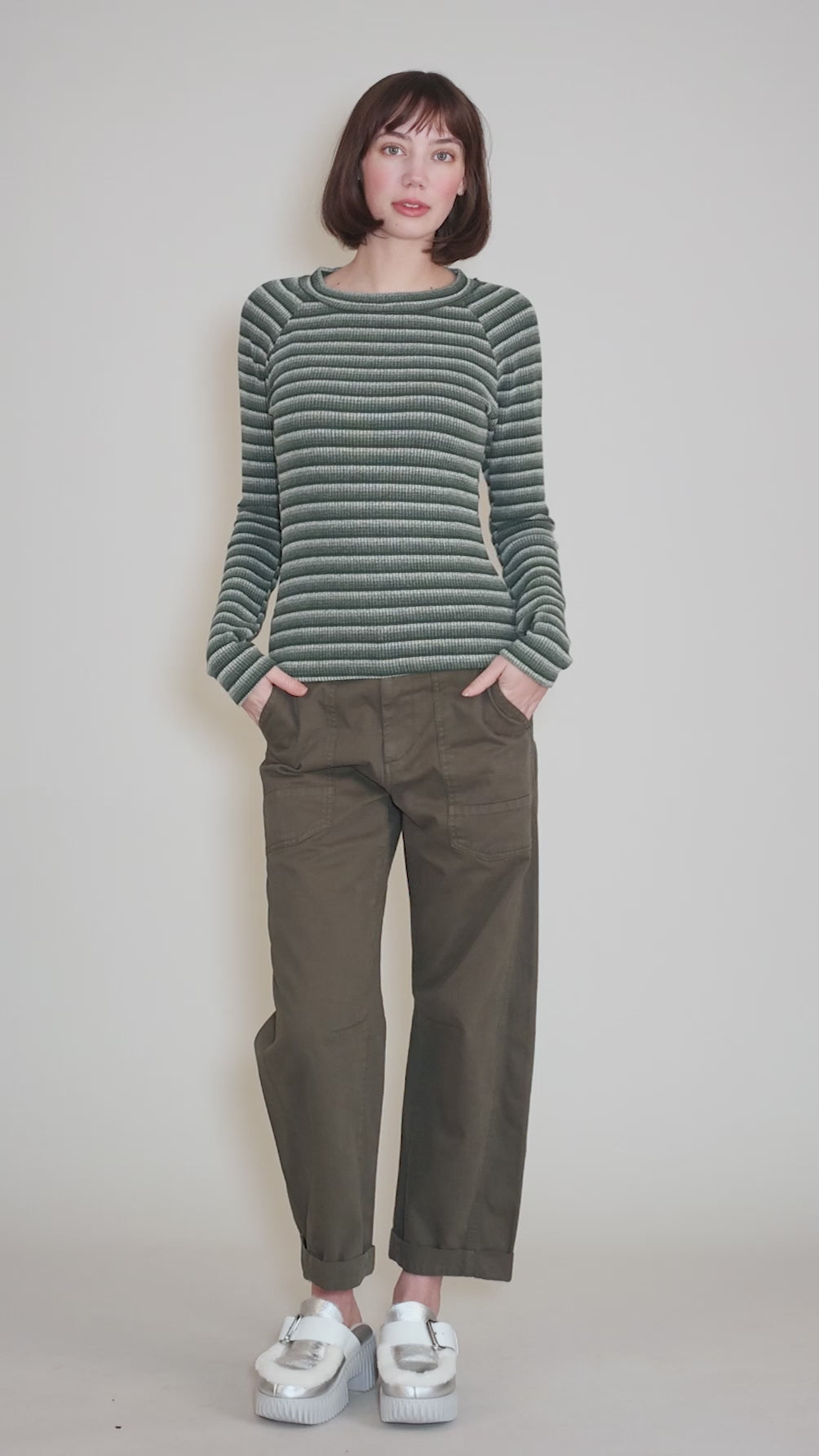 A sporty top for layering under vests or jackets, but also stands perfectly well on its own. Made in a lightweight knit poly blend, it has a crew neckline, with long raglan sleeves and a trim fit. Runs true to size to slightly small.