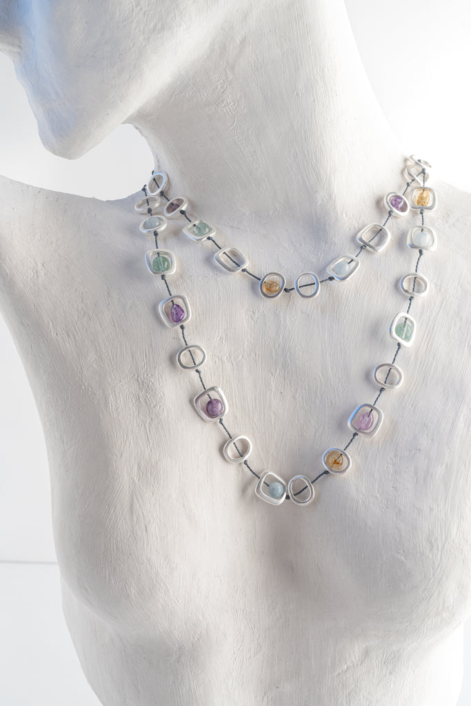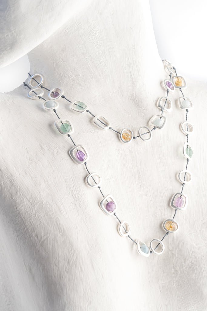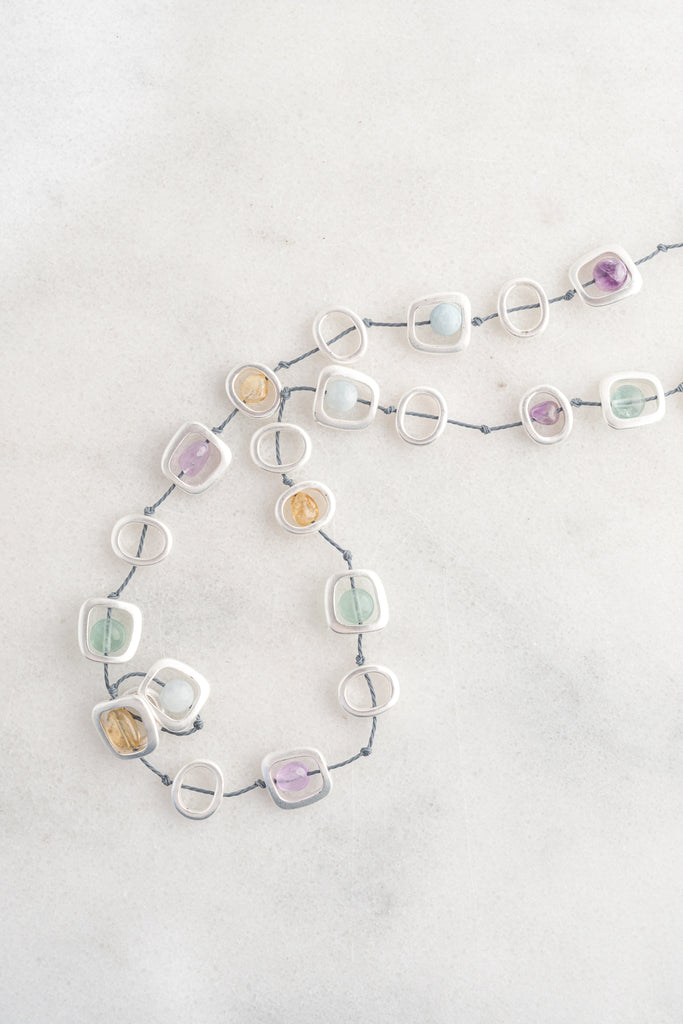A lightweight, geometric long necklace with soft silver-tone frames and pastel stone-like accents in lavender, sea glass green, pale blue and warm honey tones, it feels airy and modern, like wearable little windows of color.