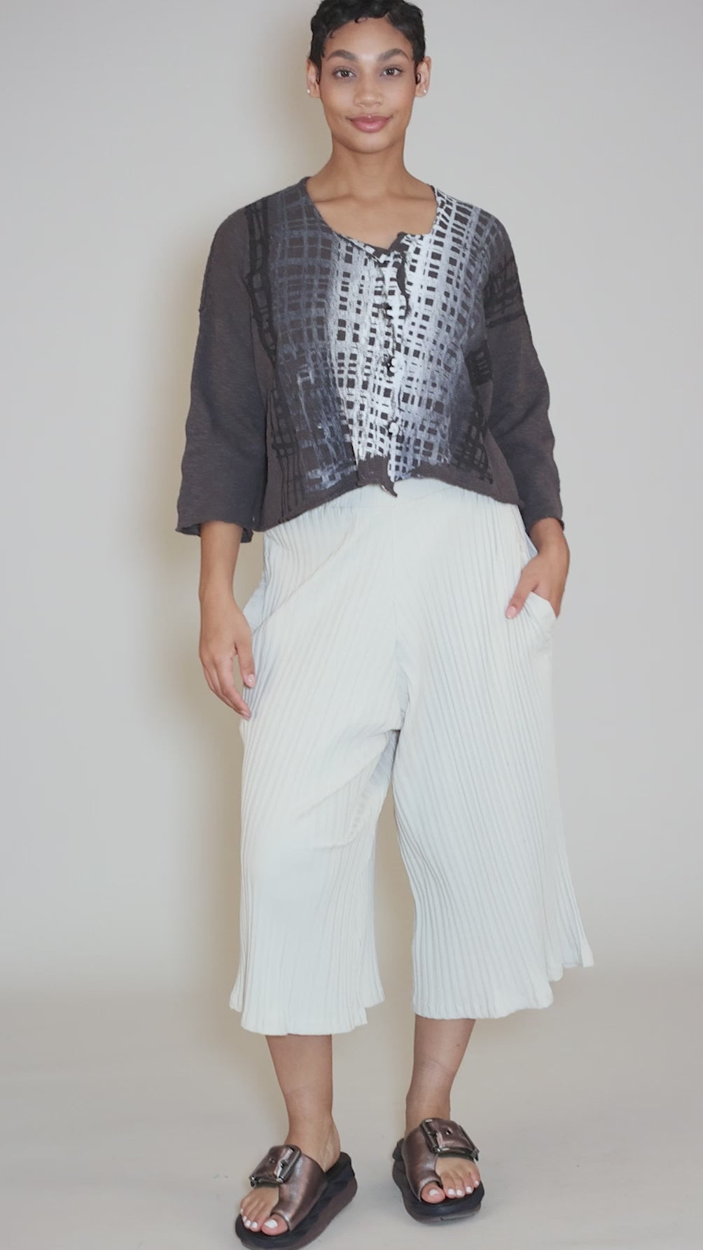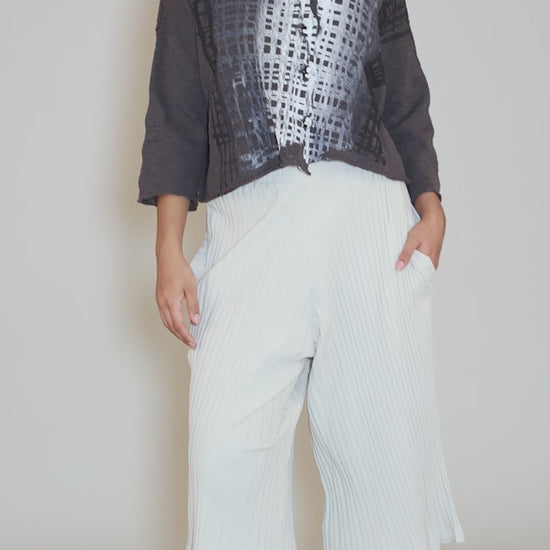 A cardigan version of our favorite Nelson sweater from Paper Temples! Nelson is done in a lightweight cotton knit, with a scoop neckline, long sleeves and a deliberately boxy silhouette. Metal buttons and an ombre crosshatch print in front add to its artful charms.