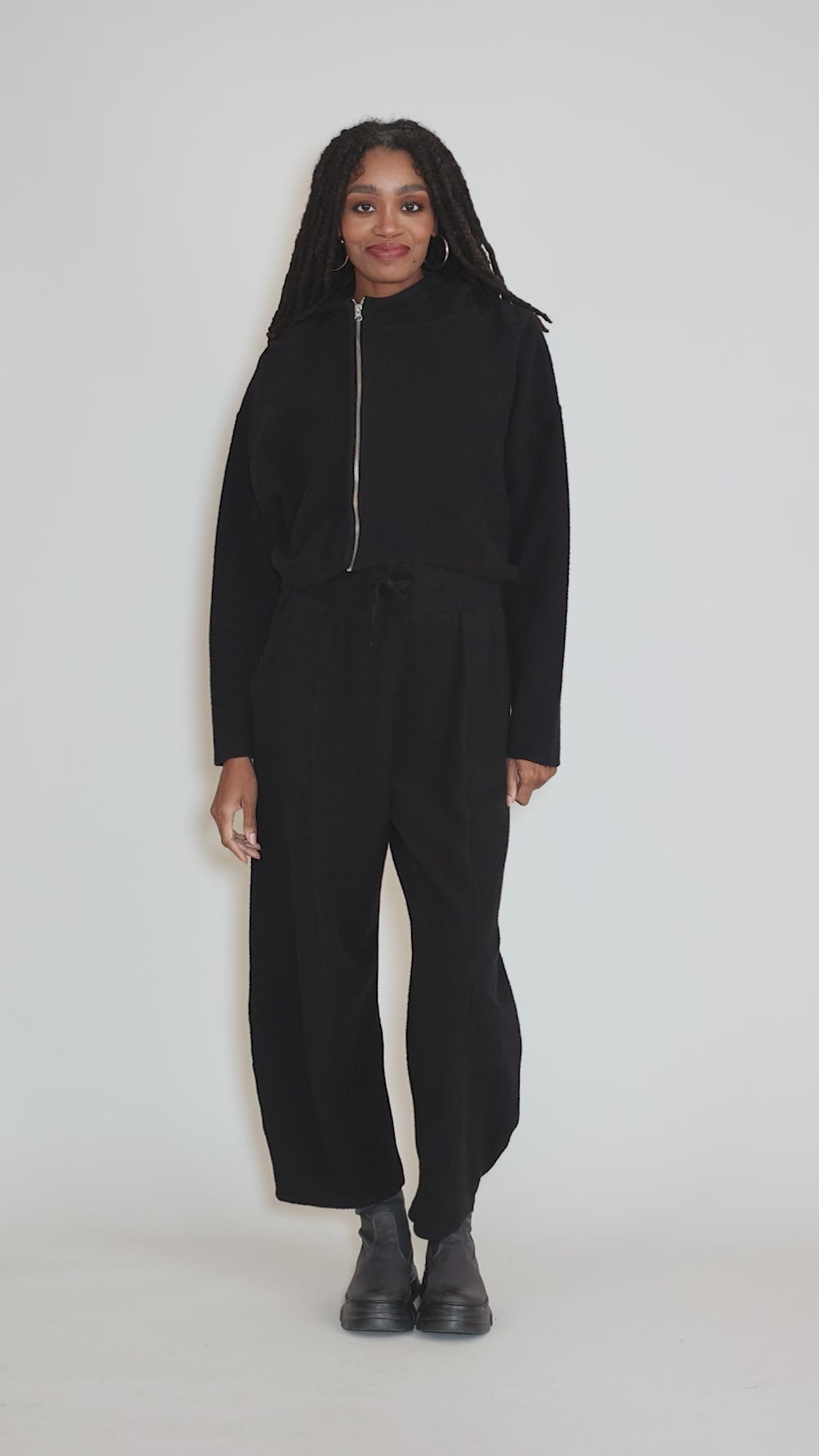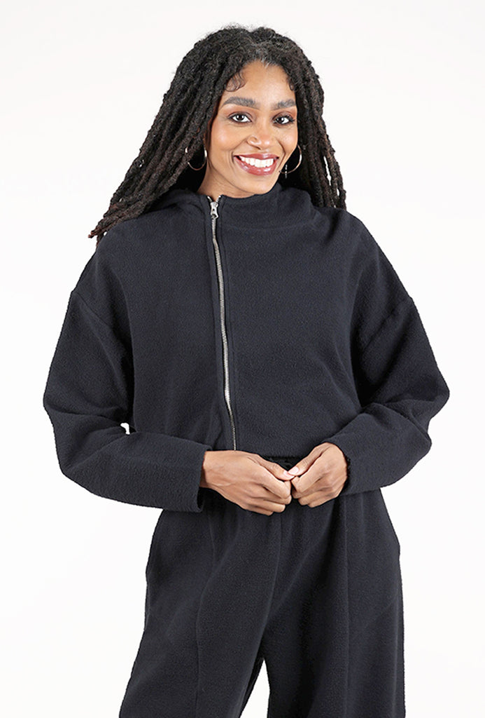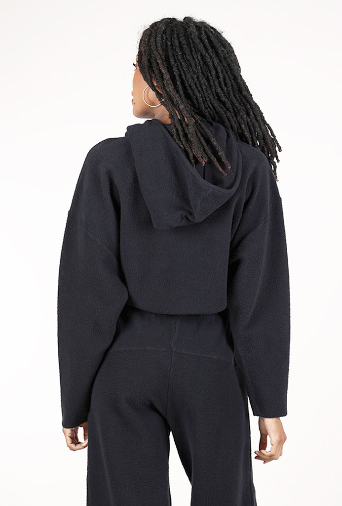 The fabric here is SO soft, a brushed cotton fleece that's fuzzy on the surface and smooth on the backside. The top itself has an oversized hood, with an off-center zipper closure and a slightly boxy, cropped silhouette.