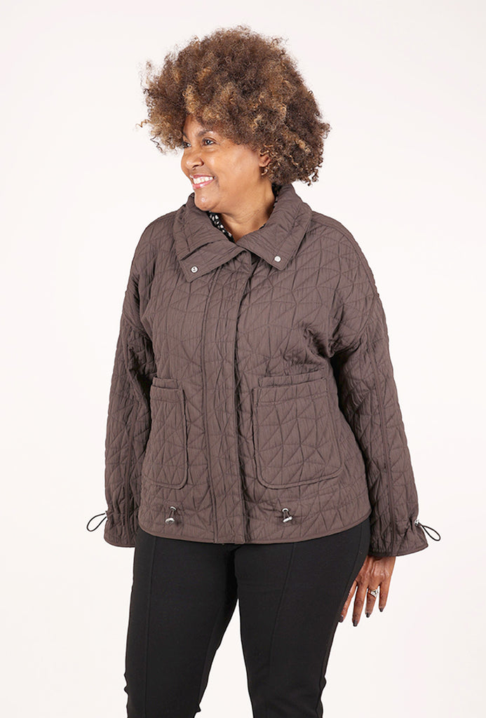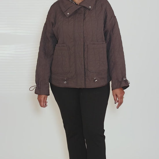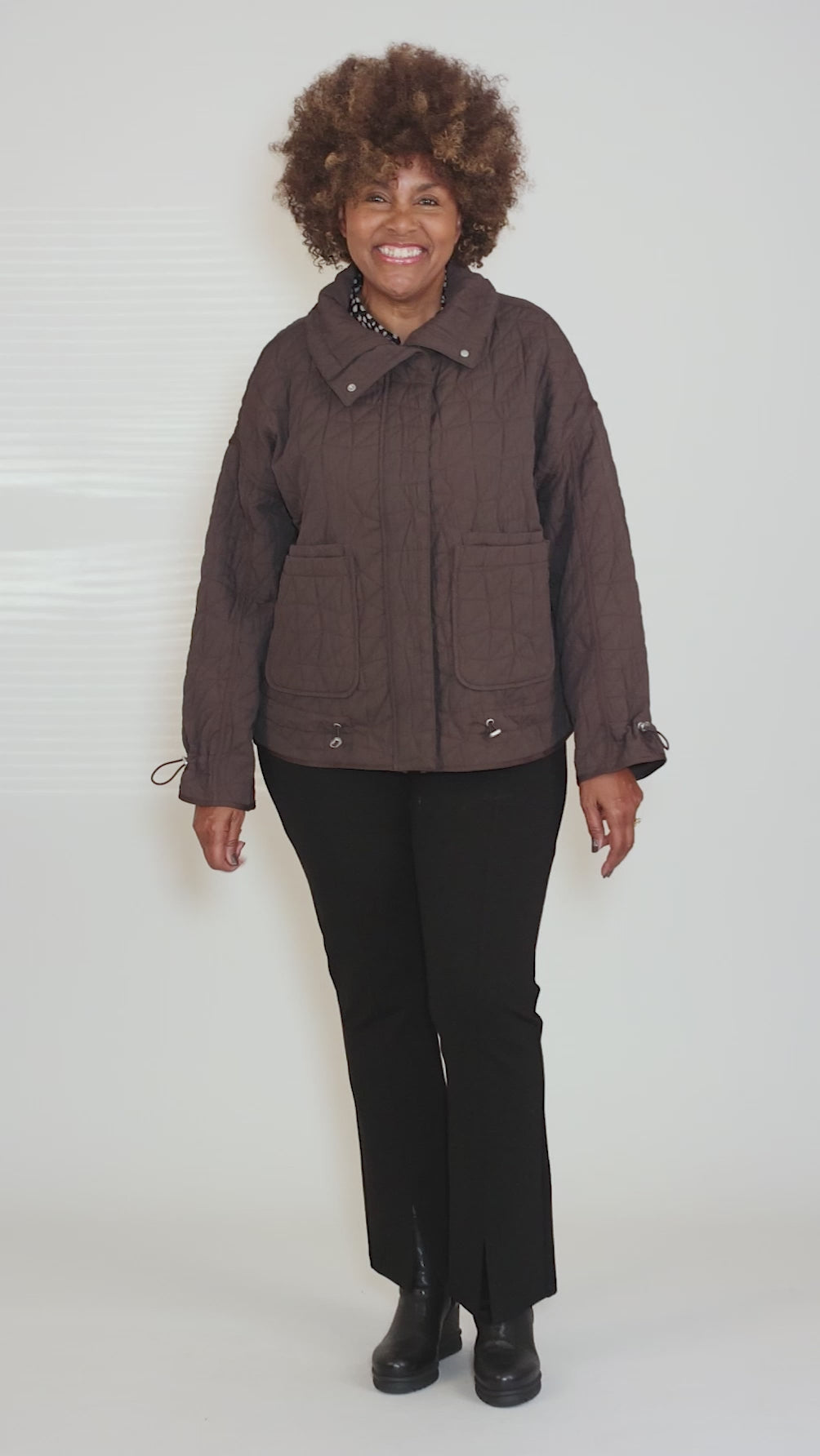 Quilted in a sleek poly blend with a bit of sheen, this lightweight jacket has a relaxed, A-line silhouette and a hidden zip-front placket. Patch pockets sit on the hip, and ripcord details at the sleeves and hemline allow for customized cinching. Running true to size.