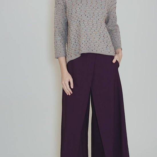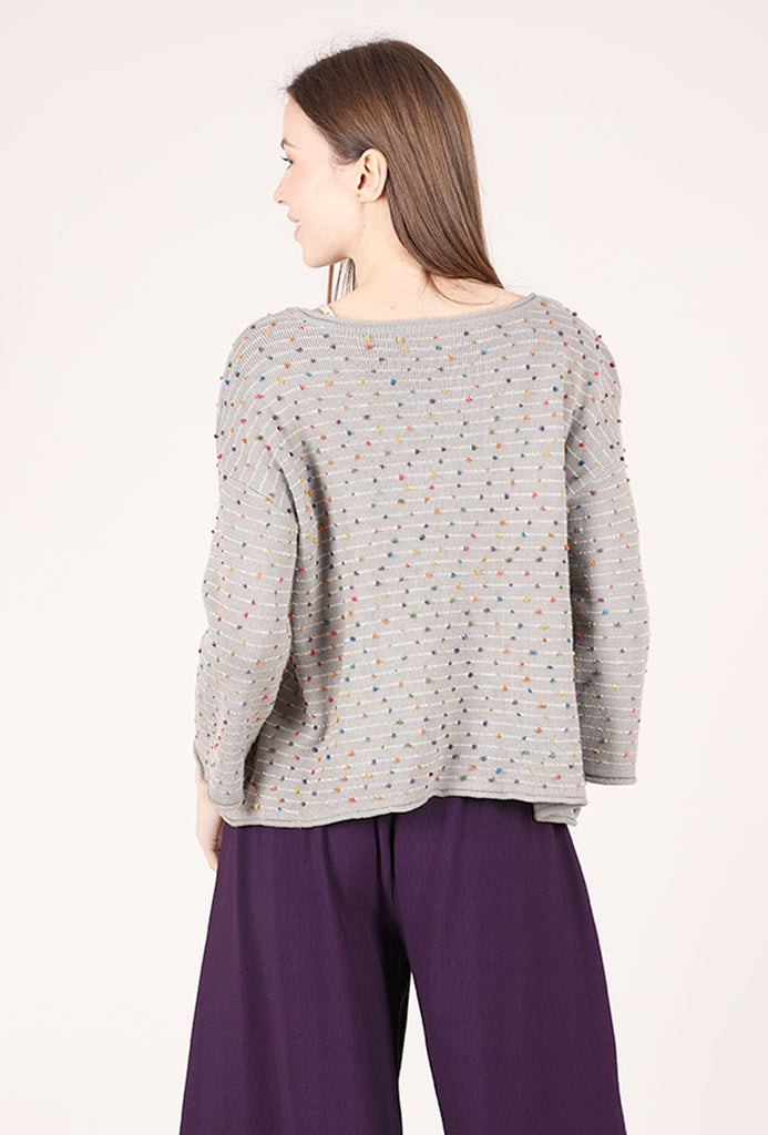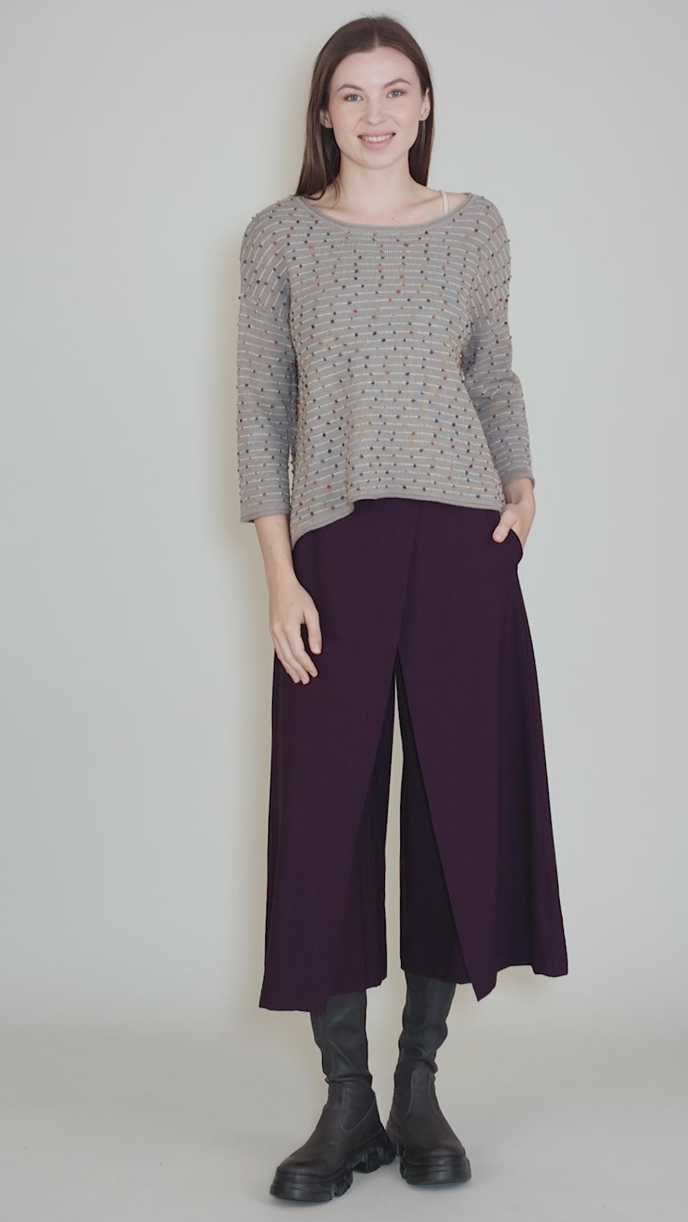 Knit in a supple cotton yarn with a bit of body, City Lights has a wide boat neckline, with a drop-shoulder construction and three-quarter-length sleeves. The body is a full A-line, with a hip-skimming length and slightly high-low hemline. We love the colors here -- dimensional yarn 'dots' in shades of pink, purple and yellow on a warm gray-taupe background.
