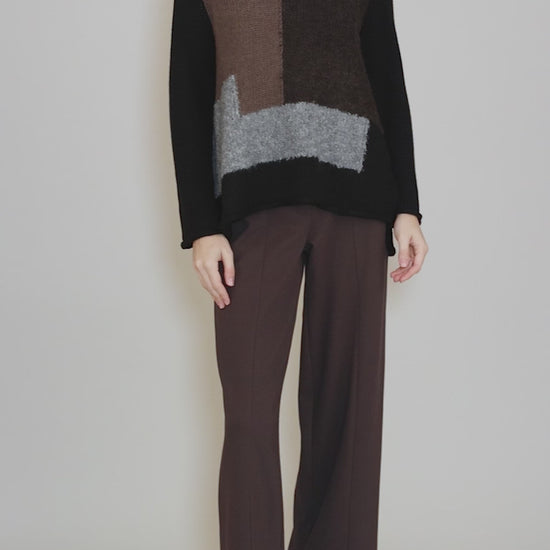 The sweater knit here is rather substantial, with a rounded neckline, a set-in shoulder and long sleeves. The body is a relaxed A-line; it's long enough to cover the bum on most. The contrasting color blocking also boasts different textures.