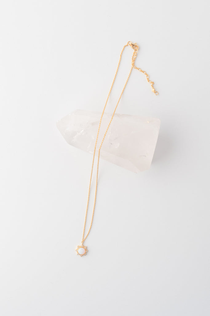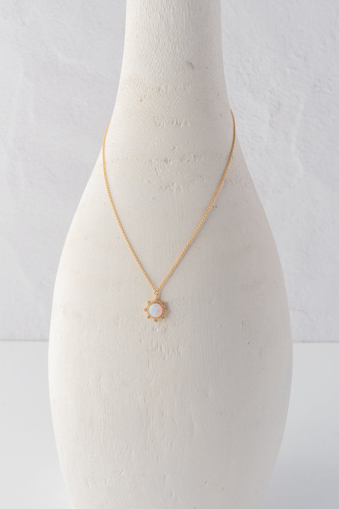 A delicate little piece for your necklace layer, or a lovely solo number for lovers of petite jewelry! It boasts a gold-plated chain, with a glimmering opal pendant set in a starburst setting, studded with cubic zirconias.