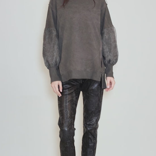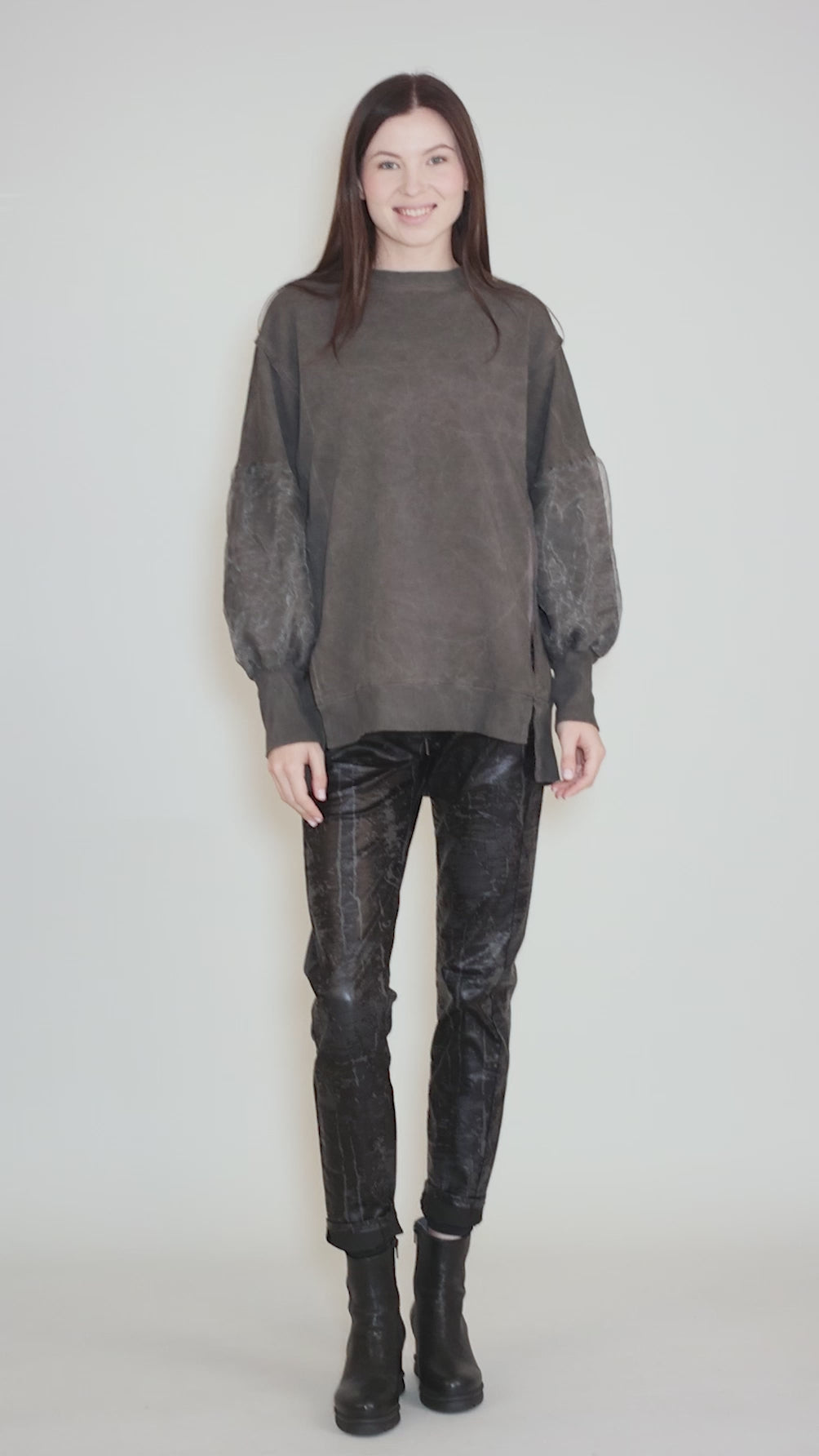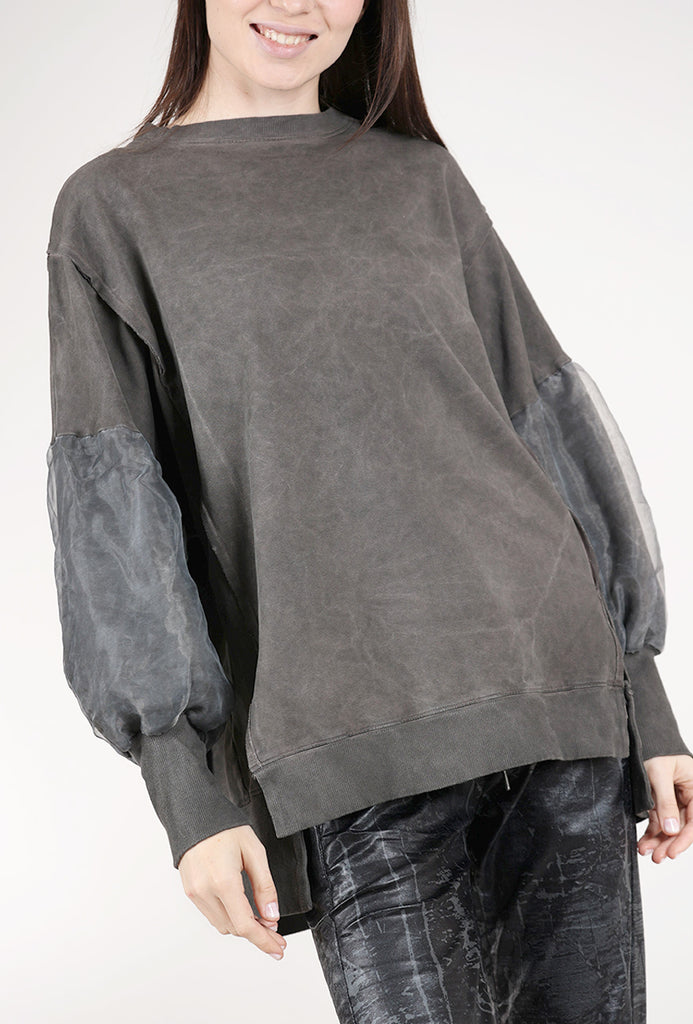 We love a dressy sweatshirt! Made in a garment-dyed jersey knit, it has a rounded neckline and an elongated body with a lightly ribbed hemline with deep side slits. But the headline here is the drop-shouldered construction, which sets up full, extravagant organza sleeves that shimmer in the light and end in ribbed cuffs. We find this is running on the large side.