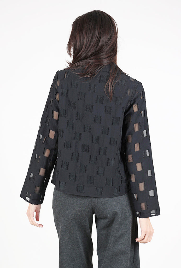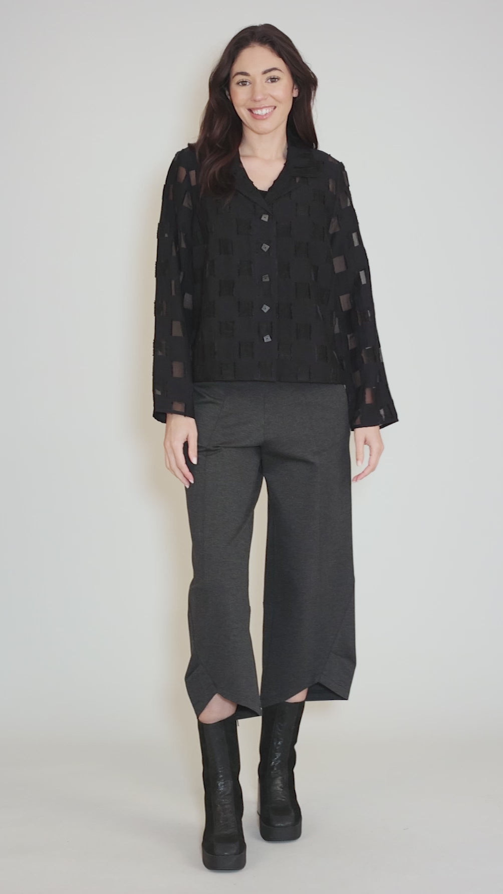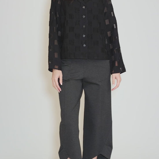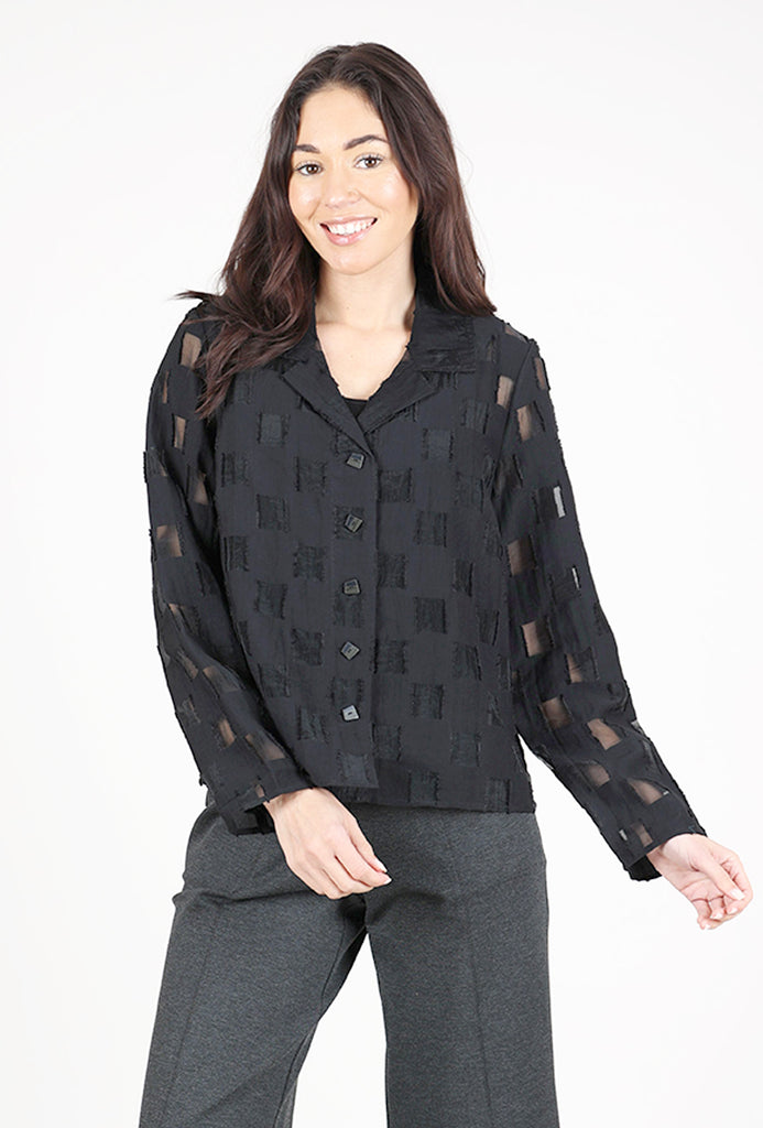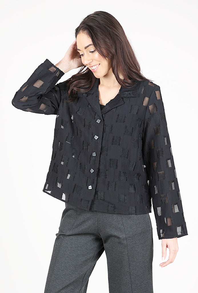 This lovely blouse can dress up or down with ease. It's made in a lightweight poly blend with a subtle sheen; a burnout square pattern gives the top its name. It has a set-in shoulder, with bracelet-length sleeves and a full, A-line silhouette. The versatile hip-skimming length lends itself to fuller-legged bottoms or slim skirts.