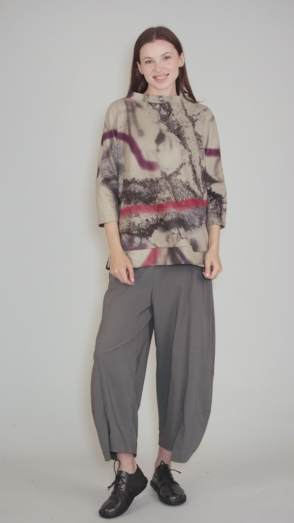 The fabric here is really quite notable, a brushed poly with almost a suede-like hand. It's used beautifully in this easy top, which has a wide funnel neckline and three-quarter-length dolman sleeves. The silhouette is A-line and relaxed.