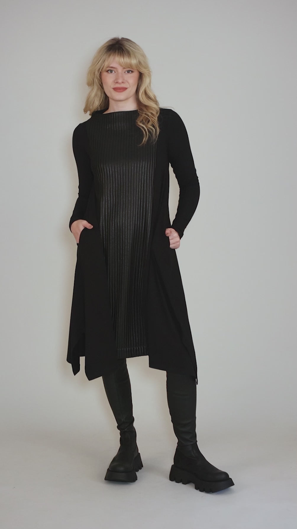 This take-no-prisoners dress combines two textures for one striking effect -- the center is a lightweight ribbed knit with a subtle sheen, while the rest of the dress is made up in a sleek cotton jersey blend. The dress has a short funnel neckline, with a set-in shoulder and long sleeves. The silhouette is a classic fit-and-flare, with a closer fit through the bust and shoulders and relaxed through the hip. The uneven hemline and slit pockets add to the fun. Running true to size.