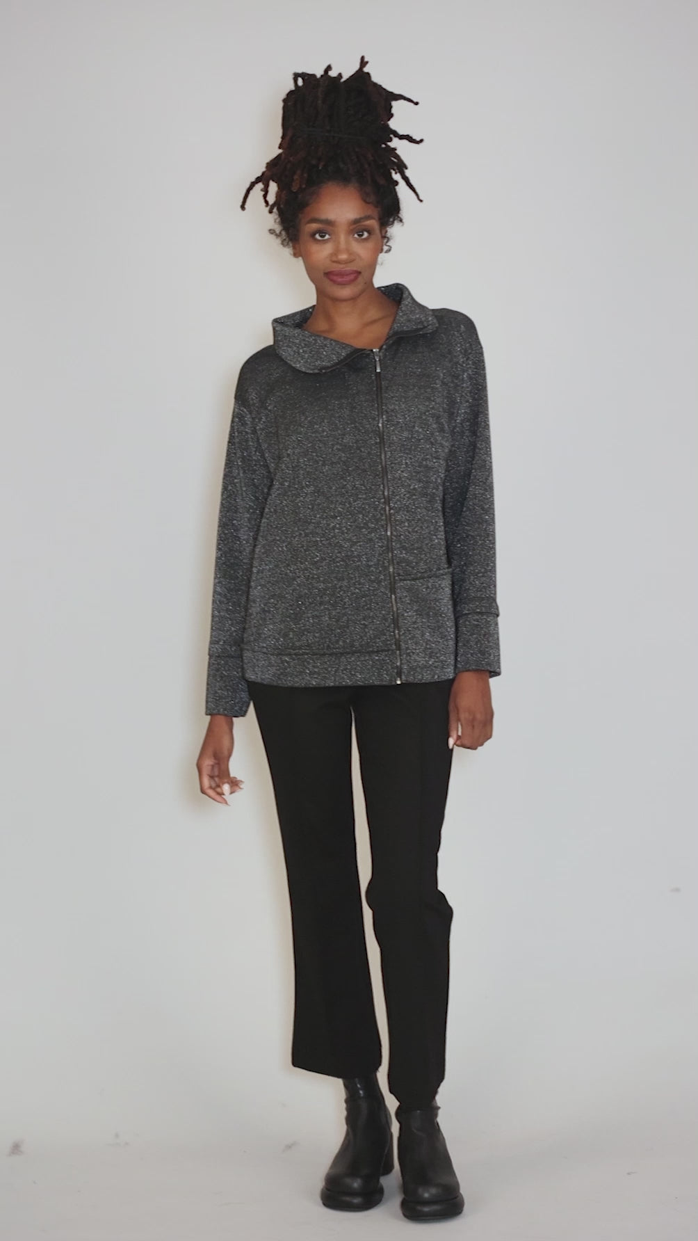 All the comfort of a French terry sweatshirt, with all the glamour of a night-out piece! Made in a mid-weight cotton fleece blend, this little jacket has a set-in shoulder, long sleeves and an off-center zip placket. Runs true to size to slightly roomy.