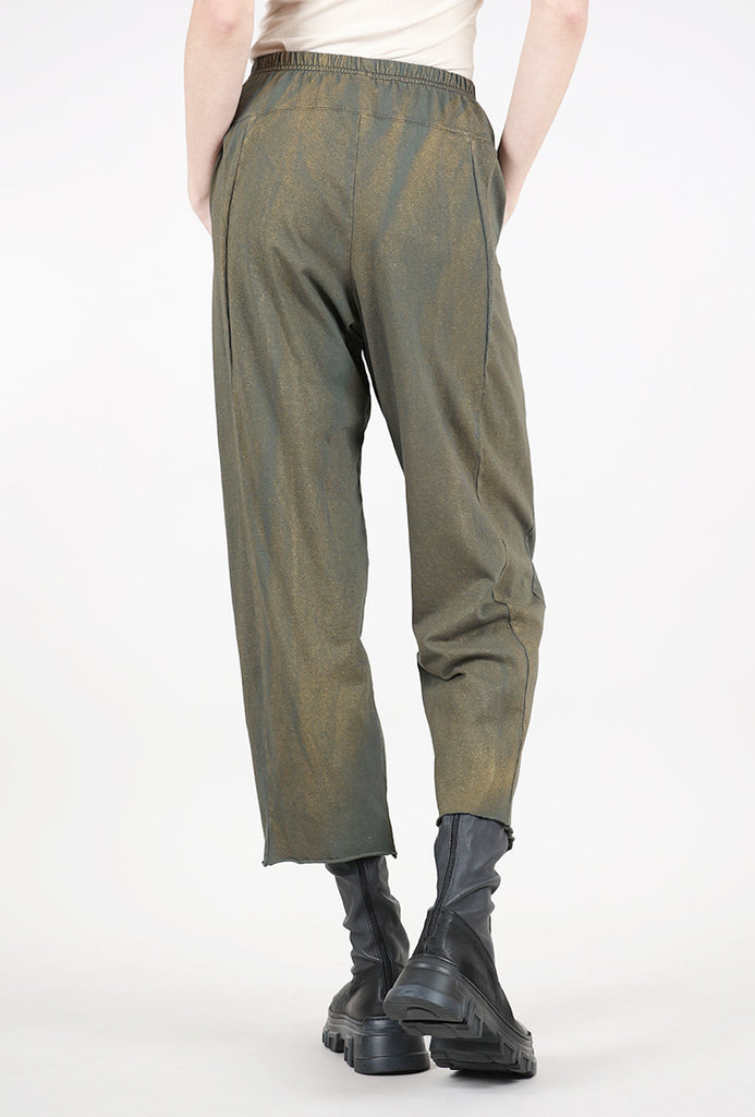 Done in a cotton jersey knit, Penn has a soft self-waistband and full, straight legs that taper slightly to the tuck-detail hemline with dimensional seaming throughout. Sloped patch pockets sit on the legs; the fit is quite relaxed, but not oversized. We love the hand-painted finish here, a shimmering gold over army green. Super special!