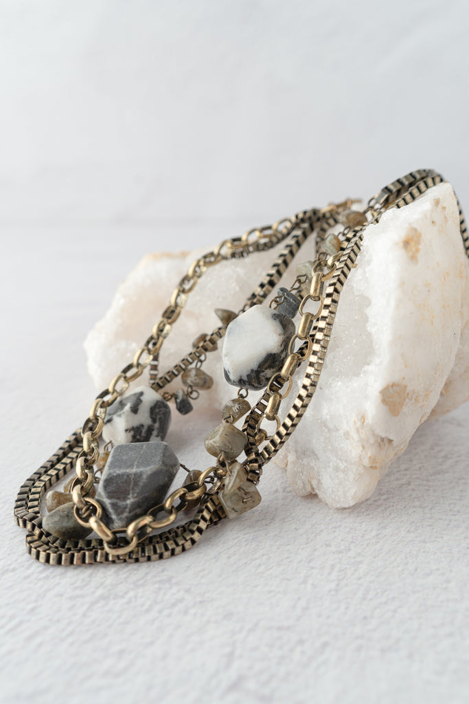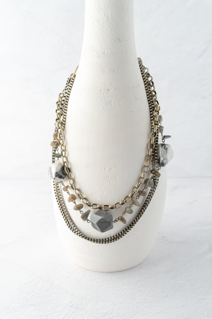 Bold and sculptural, the Peter Necklace layers mixed metal chains with faceted stones in shades of gray, white, and soft gold. The contrasting textures, smooth marbled beads against edgy box links, create a statement piece that feels both modern and organic. Its adjustable length makes it easy to wear with anything from a simple tee to a sleek dress.