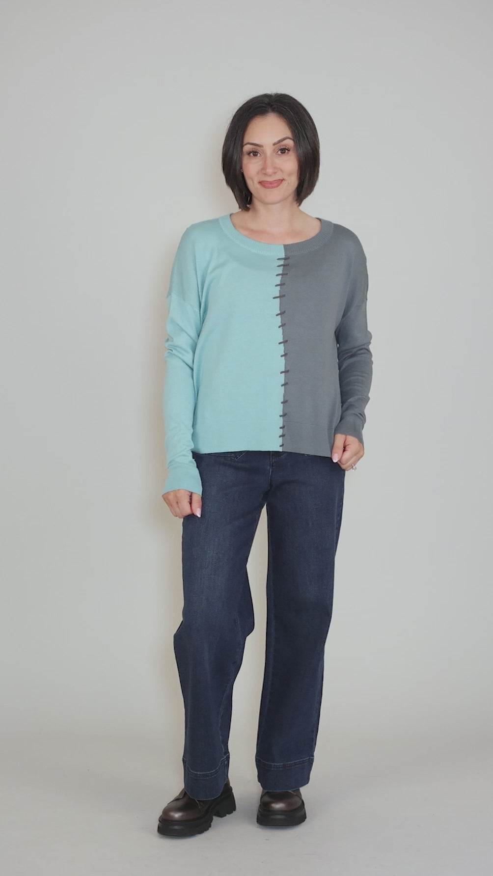 So soft! Knit in a sumptuous, lightweight cotton-Modal blend, this playful little sweater has a rounded neckline, with a drop-shoulder construction and extra-long sleeves. It is color blocked on each side, with a contrast whipstitch detail down the center, which gives the sweater its name. Wear it now with black pants and with white jeans come the summer months!