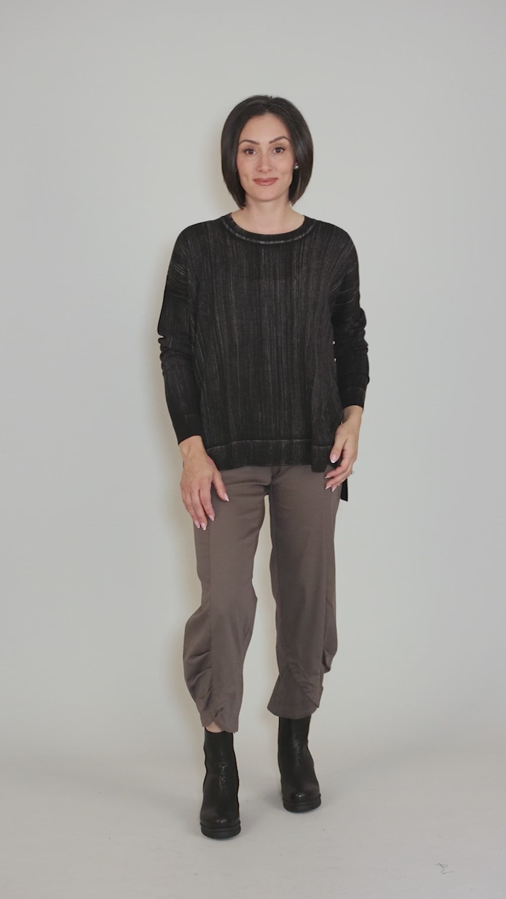 This roomy top has a crew neckline, a drop-shoulder construction and long dolman sleeves. The fabric here is really lovely, a vertically textured knit with excellent drape. It's been hand-dyed to rather cool effect, where the dye, in shades of beige, are 'combed' through the black background.