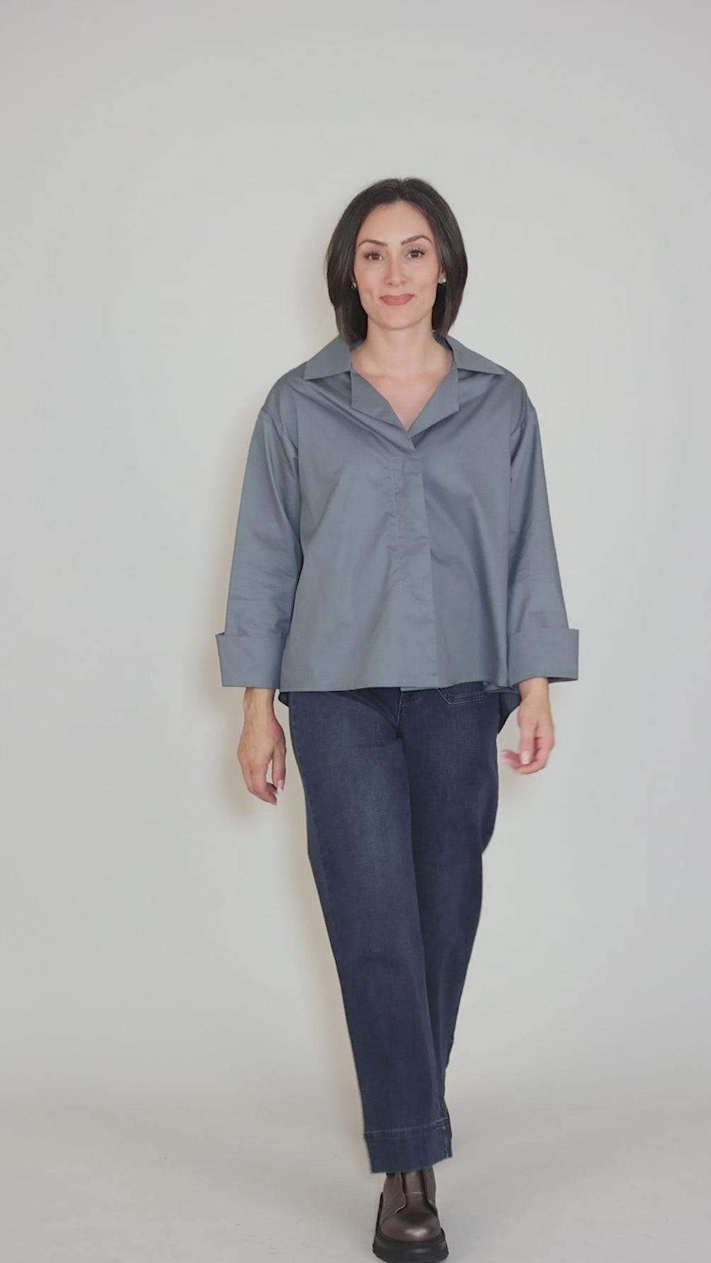 There's such a nerdy-chic vibe to this shirt! Done in a crisp woven cotton, it has long sleeves, a spread shirt collar and a hidden button-front placket. The silhouette is an oversized A-line, though the slightly cropped shape adds extra swing to the look.