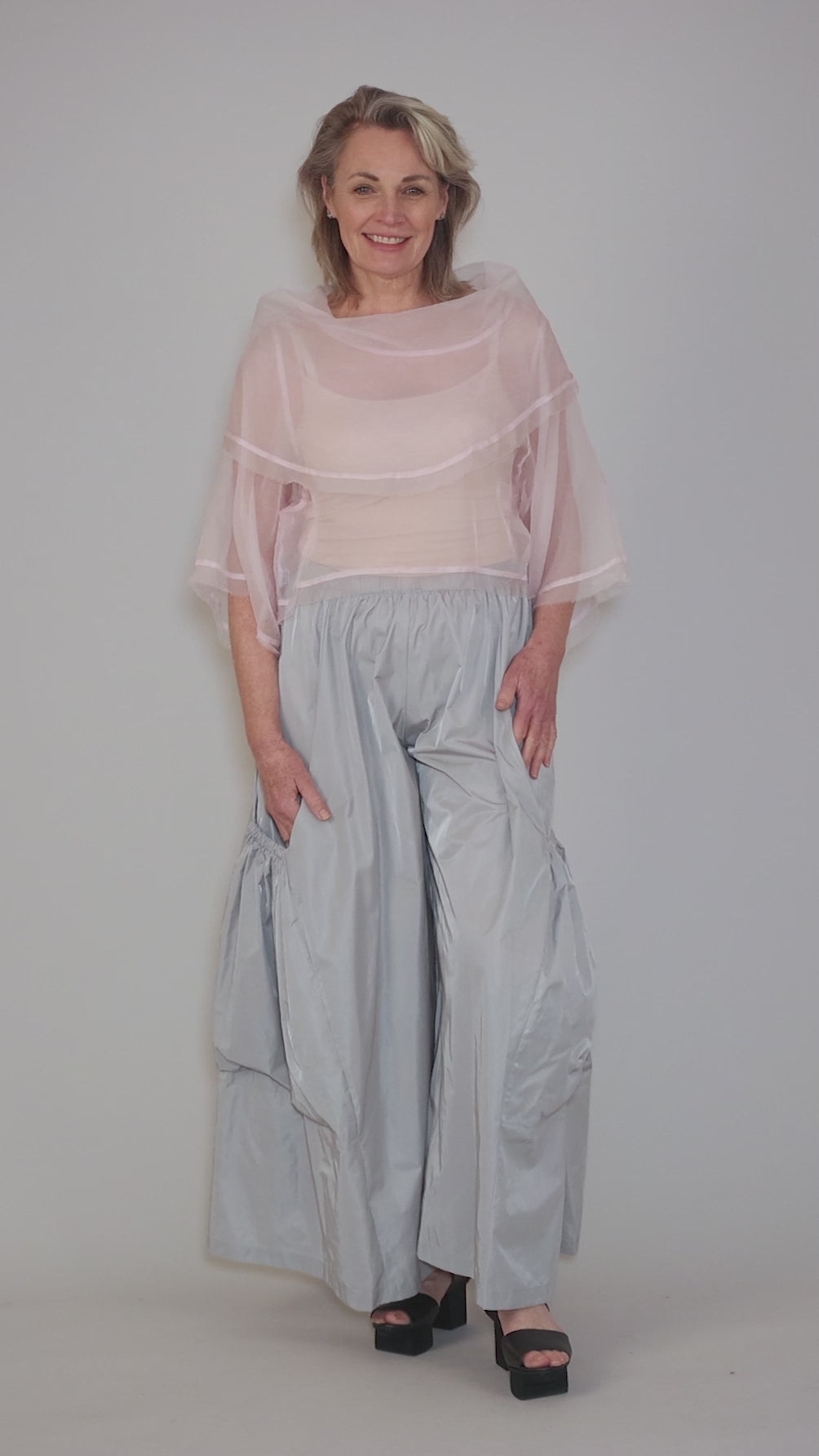 Done in Planet's beloved silk organza fabric, a semi-sheer woven with a subtle sheen, Jackie O has an extravagant cowl neckline, full sleeves that end at the forearm and a cropped silhouette. The fit is quite relaxed, and this top's shorter length makes it an excellent layering partner, especially with higher-waisted skirts.